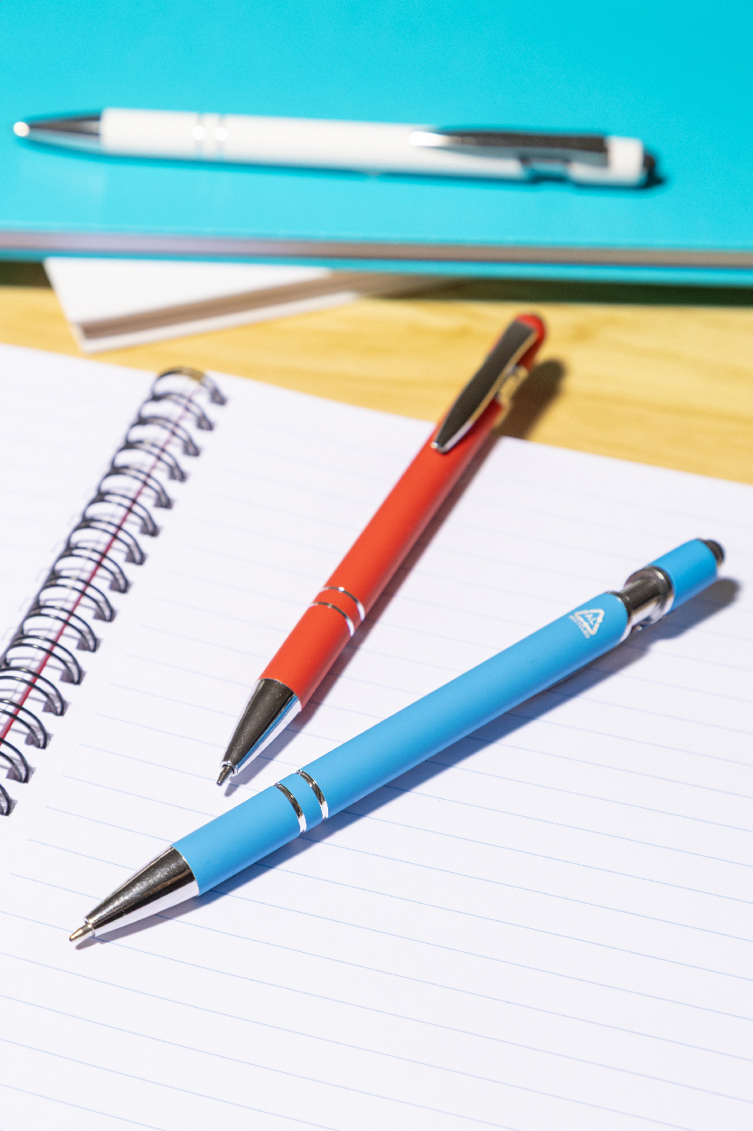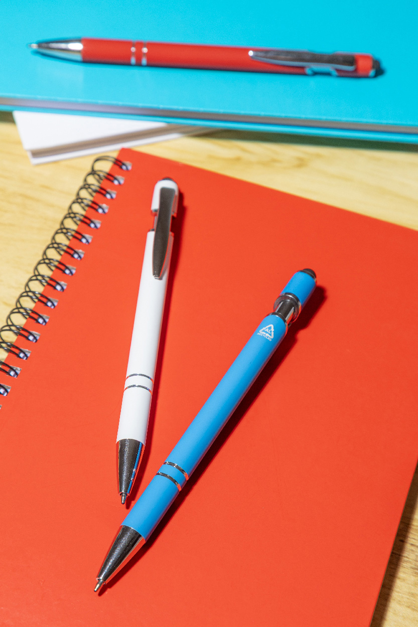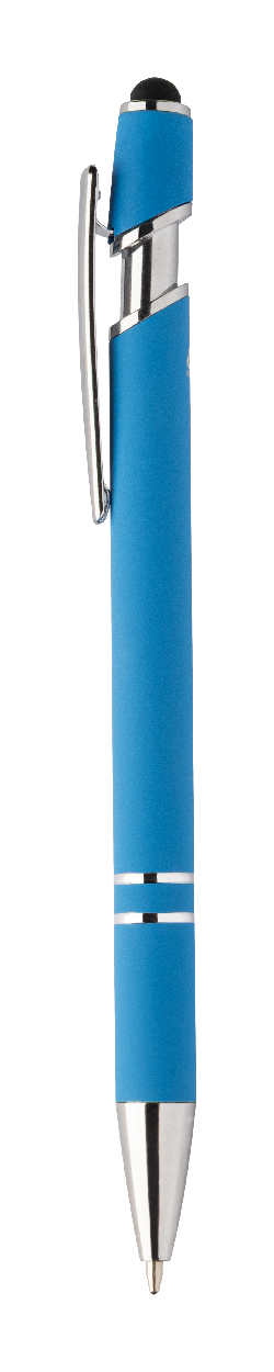 Kuličkové pero a pero pro dotykovou obrazovku z recyklovaného hliníku s pogumovaným tělem a chromovanými detaily. S modrou náplní.