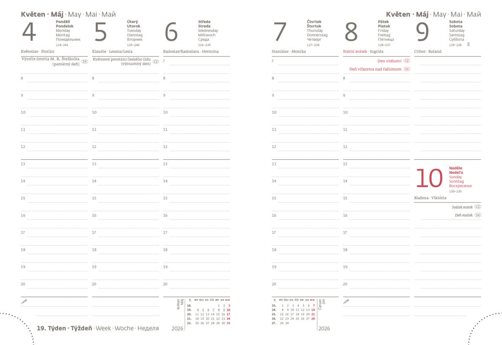 Formát diáře: 120 x 165 mm Rozsah diáře: 128 stran Kalendárium: týdenní + poutko na propisku + praktická kapsička