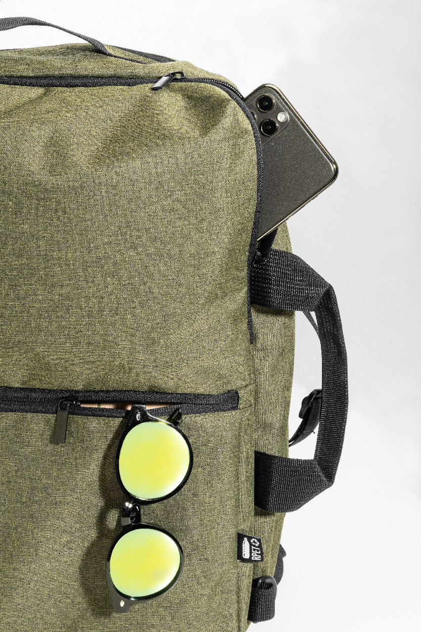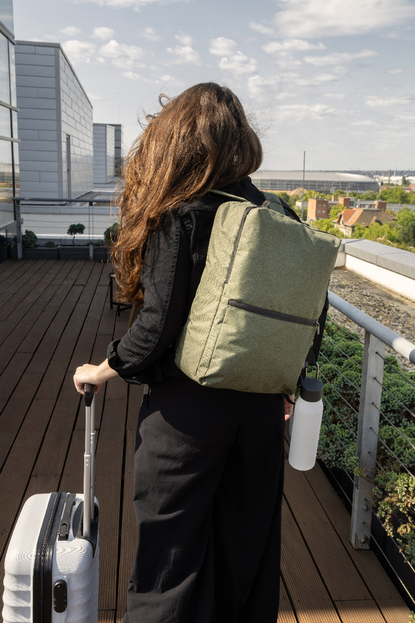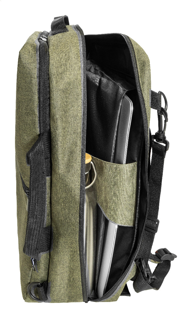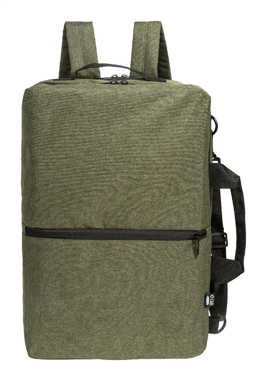 Dvojfunkční RPET batoh a taška na dokumenty s přihrádkou na zip, 2 předními kapsami na zip a polstrovanou přihrádkou na notebook (15"). S polstrovanými zády a ramenními popruhy. Součástí je i odnímatelný ramenní popruh pro použití jako taška na dokumenty. 600D RPET polyester s výrazným štítkem RPET.