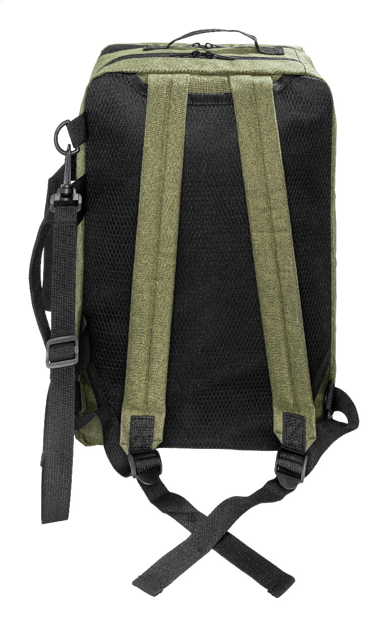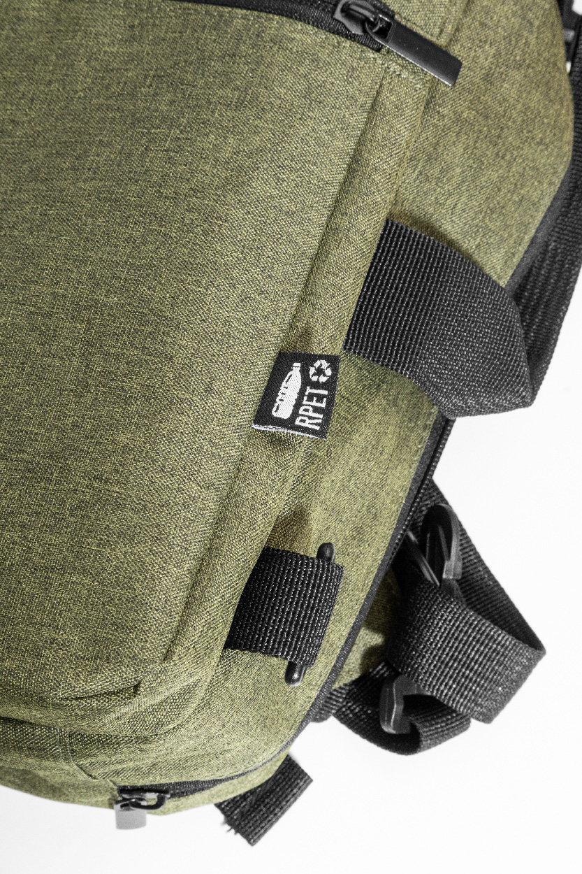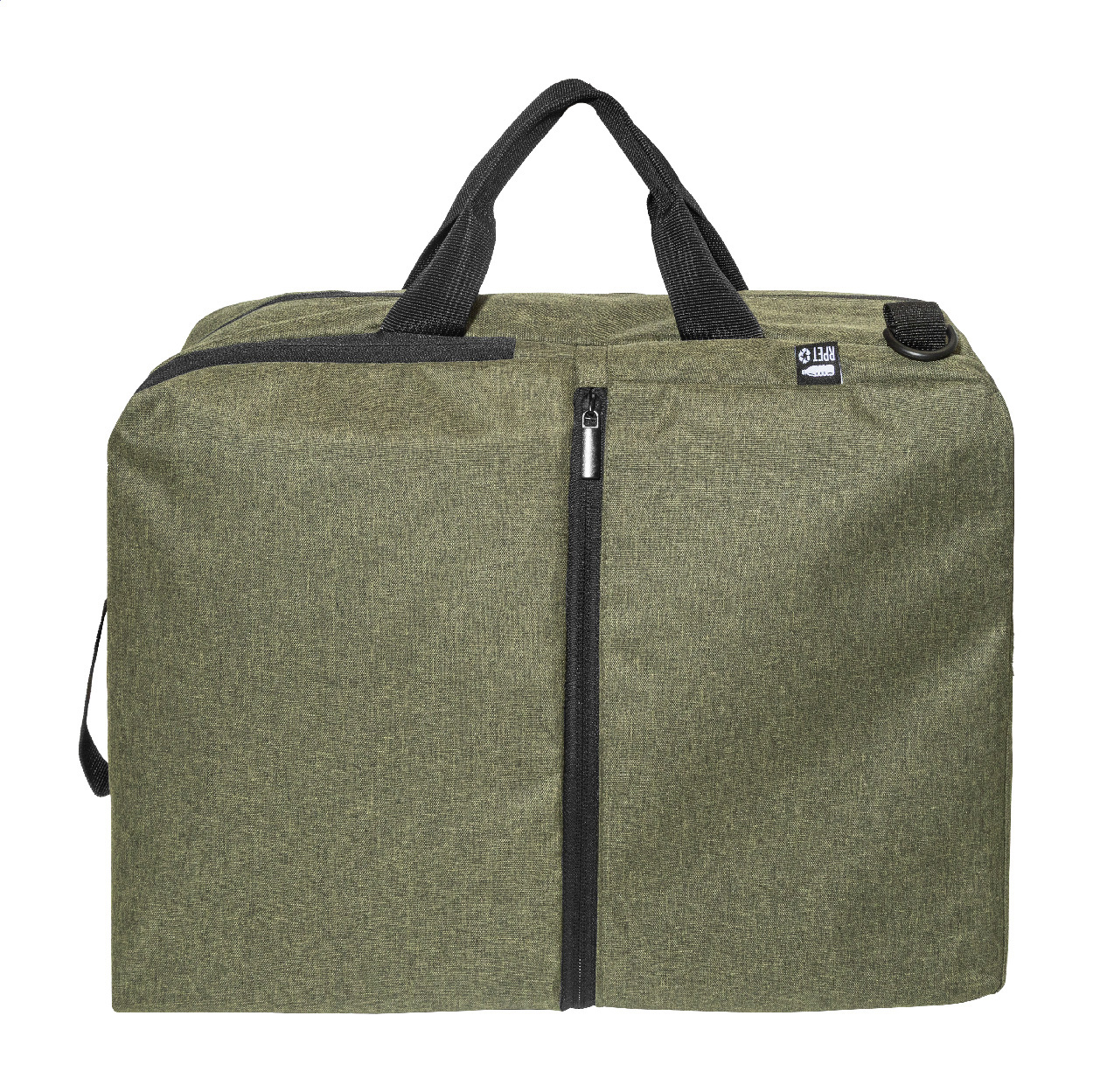 Dvojfunkční RPET batoh a taška na dokumenty s přihrádkou na zip, 2 předními kapsami na zip a polstrovanou přihrádkou na notebook (15"). S polstrovanými zády a ramenními popruhy. Součástí je i odnímatelný ramenní popruh pro použití jako taška na dokumenty. 600D RPET polyester s výrazným štítkem RPET.