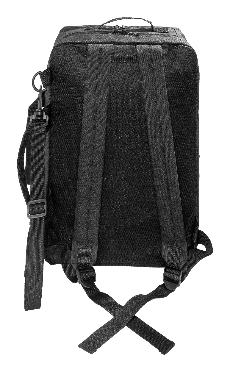 Dvojfunkční RPET batoh a taška na dokumenty s přihrádkou na zip, 2 předními kapsami na zip a polstrovanou přihrádkou na notebook (15"). S polstrovanými zády a ramenními popruhy. Součástí je i odnímatelný ramenní popruh pro použití jako taška na dokumenty. 600D RPET polyester s výrazným štítkem RPET.