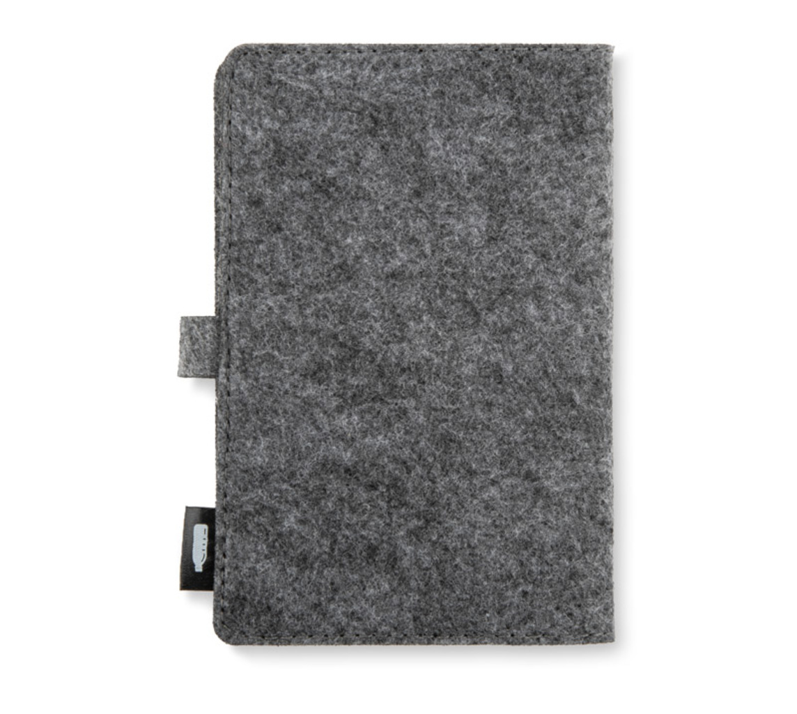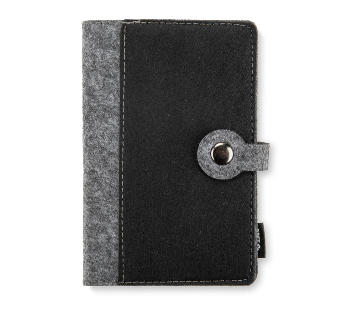Praktický zápisník A6 EVERO z plstěného materiálu rPET. Díky knoflíkovému uzávěru a kostkovaným stránkám je ideální na cesty nebo schůzky. Díky svému praktickému formátu se snadno vejde do tašky, aniž by zabíral mnoho místa. Je lehký a praktický, takže se skvěle hodí jako firemní pomůcka nebo jako součást uvítacího balíčku.