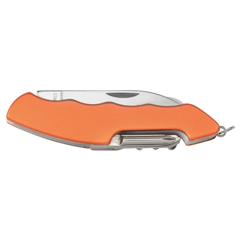 11dílný kapesní nůž s nůžkami, nožem, 1 velkou a 1 malou pilkou, otvírákem na konzervy, otvírákem na láhve, vývrtkou, pilníkem na nehty, píchátkem, děrovačem a šroubovákem, zabalený v dárkové krabičce.
