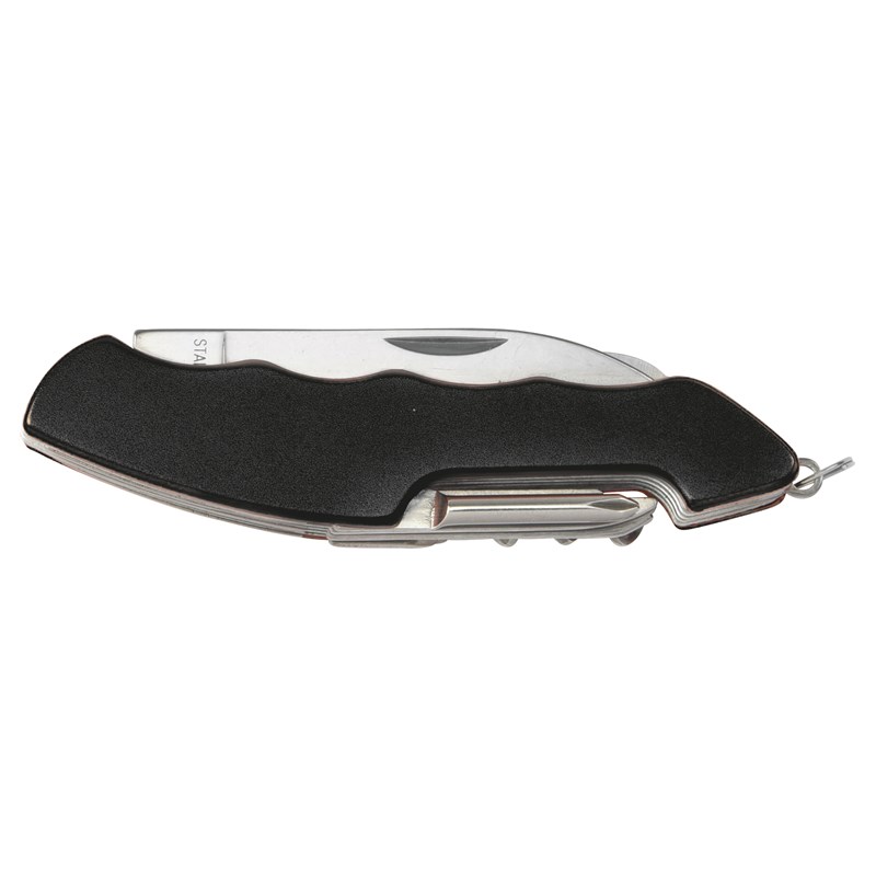 11dílný kapesní nůž s nůžkami, nožem, 1 velkou a 1 malou pilkou, otvírákem na konzervy, otvírákem na láhve, vývrtkou, pilníkem na nehty, píchátkem, děrovačem a šroubovákem, zabalený v dárkové krabičce.