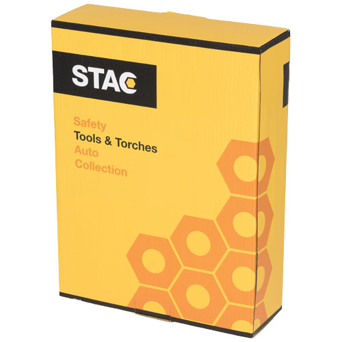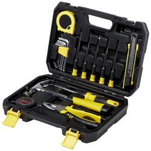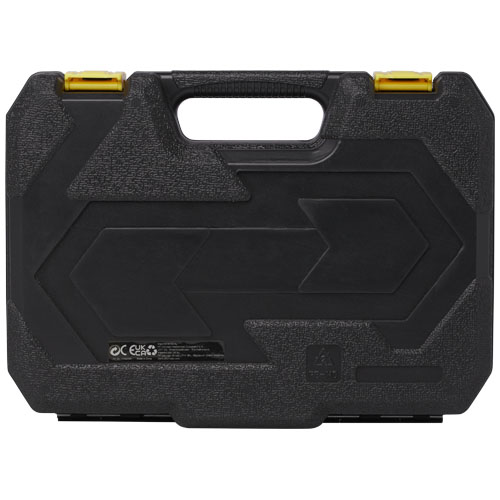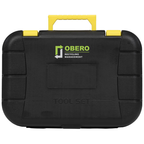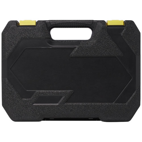 Skříňka na nářadí s posunovacím mechanismem zamykání obsahuje kladivo, 3,5m svinovací metr s uzamykací funkcí, francouzský klíč, nůž s blokovací funkcí, 3cestná vodováha, 8 imbusových klíčů (1,5-6mm) v držáku, dlouhé kleště, štípací kleště, šroubovák s testerem napětí , 4 šroubováky (ploché a Philips) a rukojeť šroubováku s 10 bity (PH, PZ, ploché, hex a adaptér) v držáku.