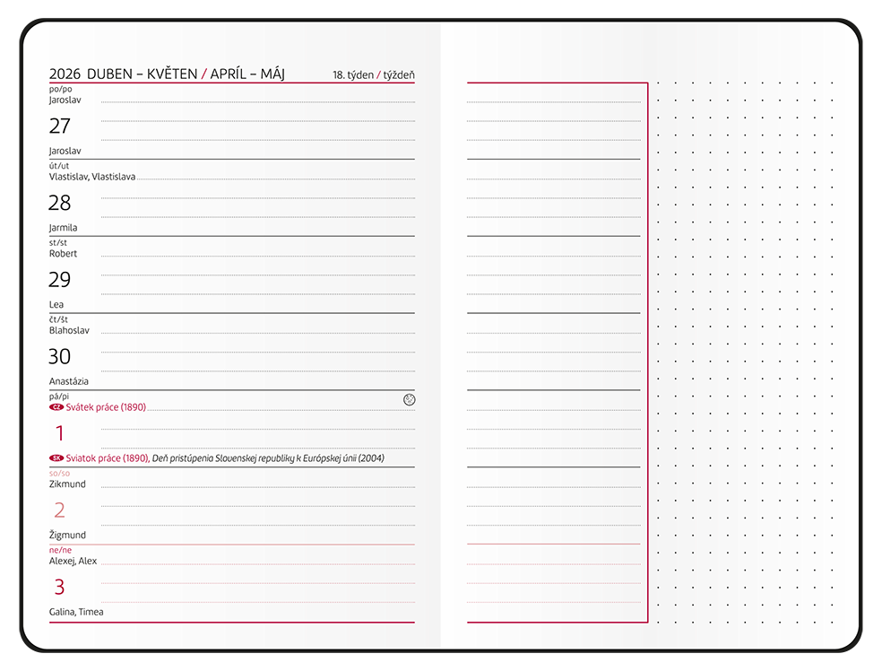 | Barva a materiál: | šitá vazba V8, tištěná grafika potažená matným laminem s parciálním lakem, kulaté rohy, gumička, stužka | ||||||||||||