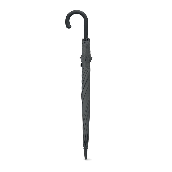 23'' deštník s automtickým otevíráním ze 190T pongee s černým kovovým tělem. Černá sklolaminátová žebra a černé plastové koncovky. Černé tvarované držadlo z ABS se šedým tlačítkem. Manuální zavírání.