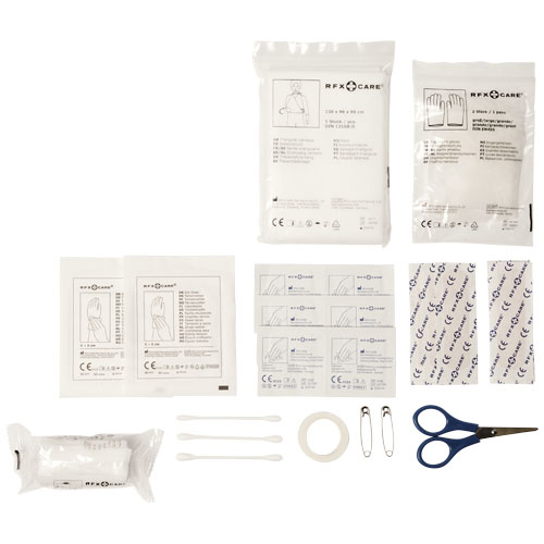 Pevná a odolná voděodolná taška z celtoviny s 30 díly prostředků první pomoci. Rolovací svrchní zapínání s plastovou sponou zajišťuje, že je obsah v suchu a v bezpečí. Skvělé pro vodní sporty a jiné venkovní aktivity. Sady první pomoci vám pomohou provést jednoduché ošetření ran, a omezí tak sekundární poranění. Sada první pomoci je považována za lékařské zařízení a řídí se normou 93/42/EHS na základě zamýšleného použití: „diagnostika, prevence, sledování, léčba nebo zmírňování onemocnění“. Toto zařízení patří do TŘÍDY I.