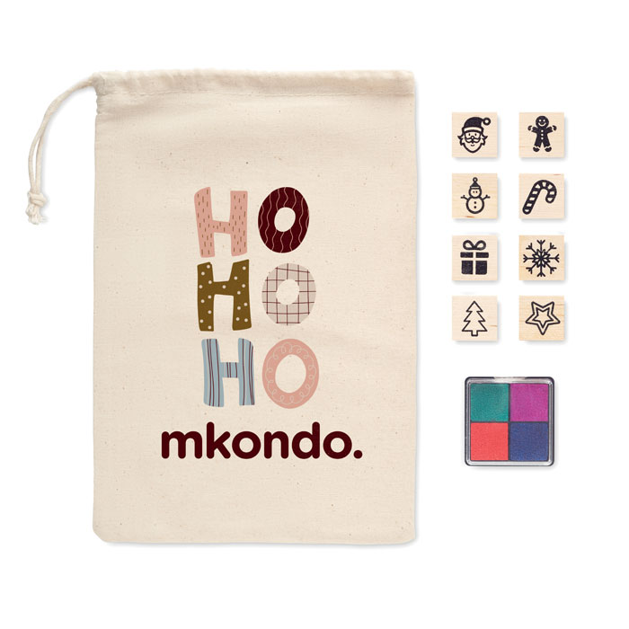Sada 8 dřevěných vánočních razítek a čtyřbarevného razítkového inkoustu v bavlněném sáčku se šňůrkou.