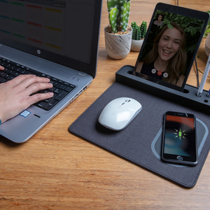 Praktická vychytávka pro váš pracovní stůl. Moderně navržená podložka pod myš disponující integrovanou USB a bezdrátovou nabíječkou pro pohodlné dobíjení telefonu stále po ruce, stojánkem na telefon a 4 pera. Protiskluzná spodní část. Včetně komfortního 1,5m dlouhého kabelu. Vstup: 5V/1A. Výstup: 5V/1A, bezdrátový výstup: 5V/1A 5W.