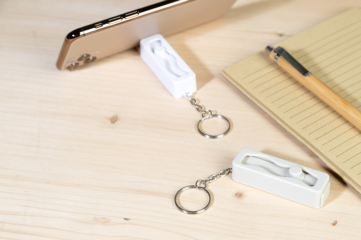 Antistresový přívěšek na klíče fidget z recyklovaného ABS materiálu s integrovaným držákem na mobil a kovovým kroužkem.