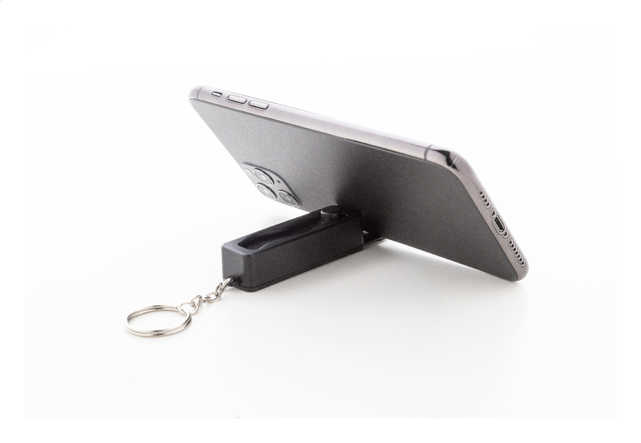 Antistresový přívěšek na klíče fidget z recyklovaného ABS materiálu s integrovaným držákem na mobil a kovovým kroužkem.