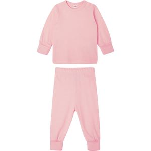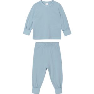 QR kód na štítku pro sledování dodavatelského řetězce, kulatý výstřih se 2 knoflíky, dlouhé manžety na rukávech a nohavicích, které lze ohrnout, štítek s pokyny pro péči o prádlo z bio bavlny, štítek TearAway