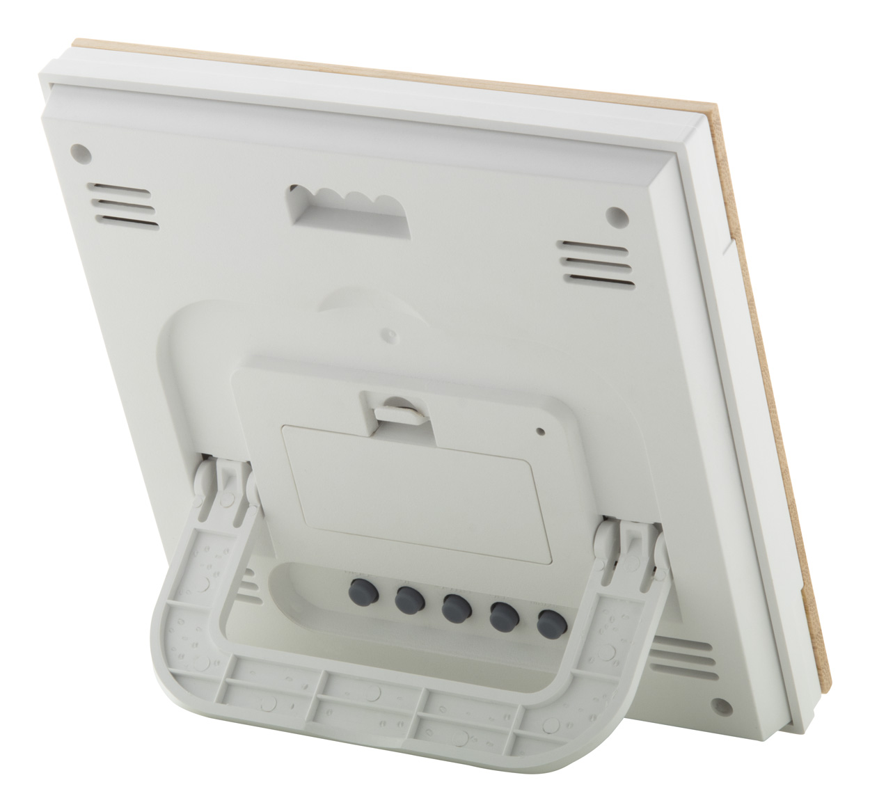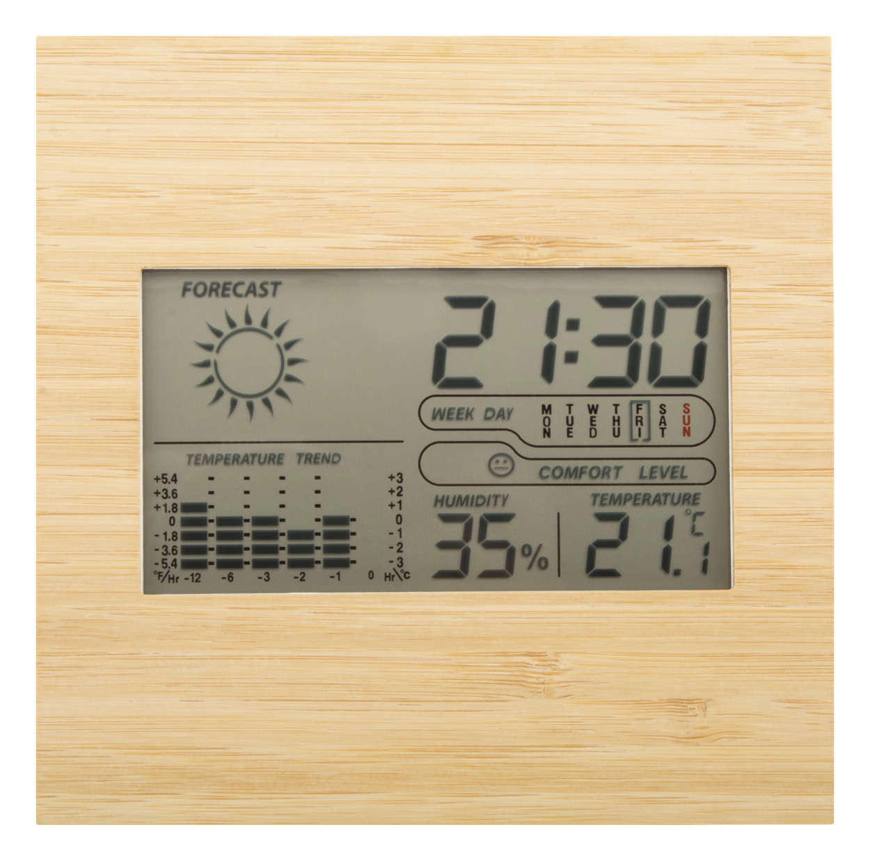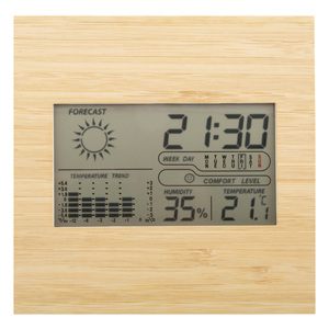 Meteorologická stanice a digitální hodiny s bambusovým předním panelem. Funkce: budík, kalendář, teploměr, zobrazení vlhkosti a paměť teploty. Pracuje se 2 bateriemi AAA, dodáváno bez baterií.