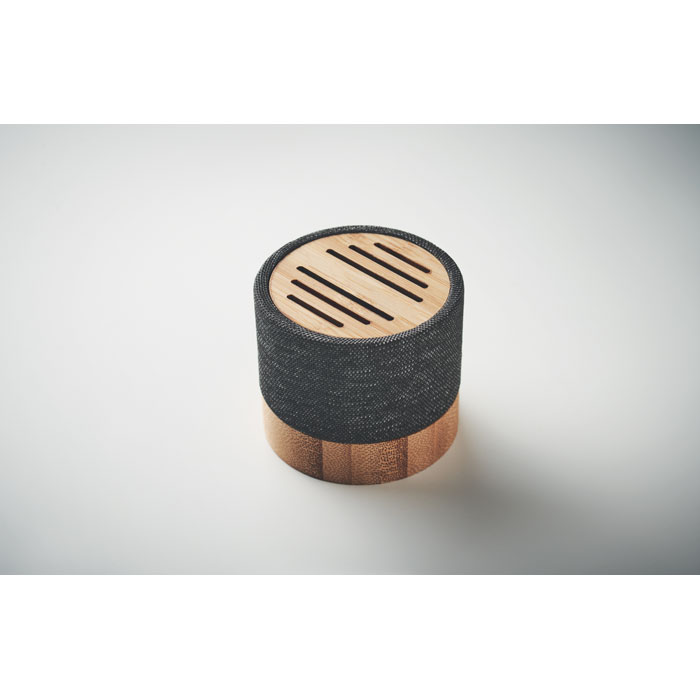 Bezdrátový reproduktor 5.0 v krytu z RPET s bambusovým detailem na horní straně. Se světelnou LED indikací, 1 dobíjecí baterií Li-ION 400 mAh, portem pro SD kartu a kabelem AUX/USB. Funkce volání handsfree. Výstupní údaje: 3W, 3 Ohm a 5V. Doba přehrávání cca 3 h. Bambus je přírodní materiál, může dojít k mírným změnám barvy, dekorace a velikosti.
