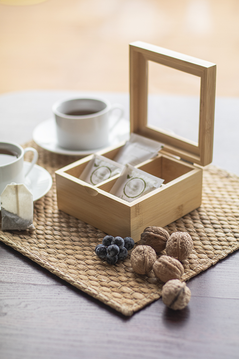 Bambusová krabička na čaj s průhledným akrylovým víkem a 4 přihrádkami.