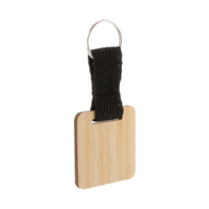 Přívěšek na klíče z bambusové překližky s polyesterovým páskem a kovovým kroužkem.