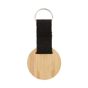 Přívěšek na klíče z bambusové překližky s polyesterovým páskem a kovovým kroužkem.