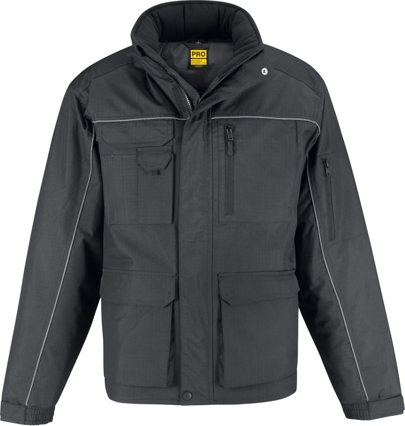 Vysoce funkční, těžká pracovní bunda, ergonomická, skrytá kapuce, nastavitelné manžety se suchým zipem, 12 multifunkčních kapes, 1 snadno přístupná kapsa na smartphone se suchým zipem na vnější straně, 1 kapsa na rukávu se zipem, 3 další vnější kapsy na pero, 2 přední kapsy s dvojitým vstupem a fleecové kapsy k zahřátí rukou s bočním vstupem stejně jako klopa se zapínáním na suchý zip, 1 našitá vnitřní kapsa se suchým zipem, prodloužená záda, přístup k zušlechtění na zádech a hrudi, pratelné na 30°, nelze žehlit, nelze sušit v sušičce