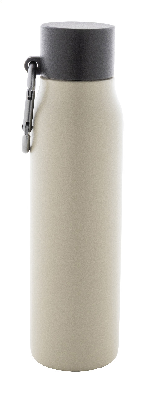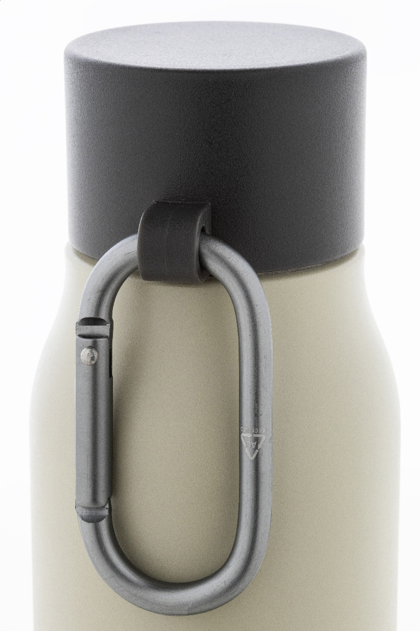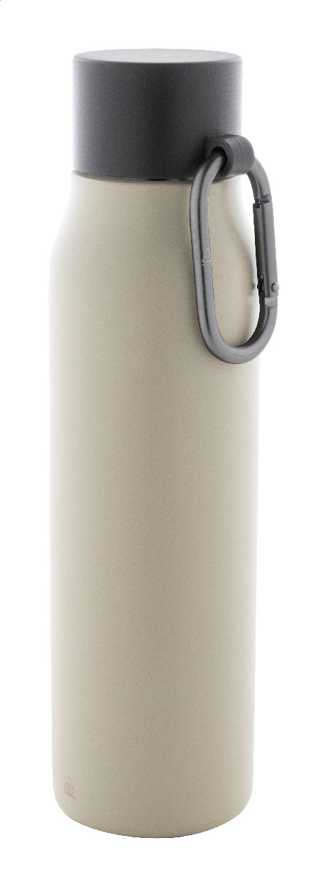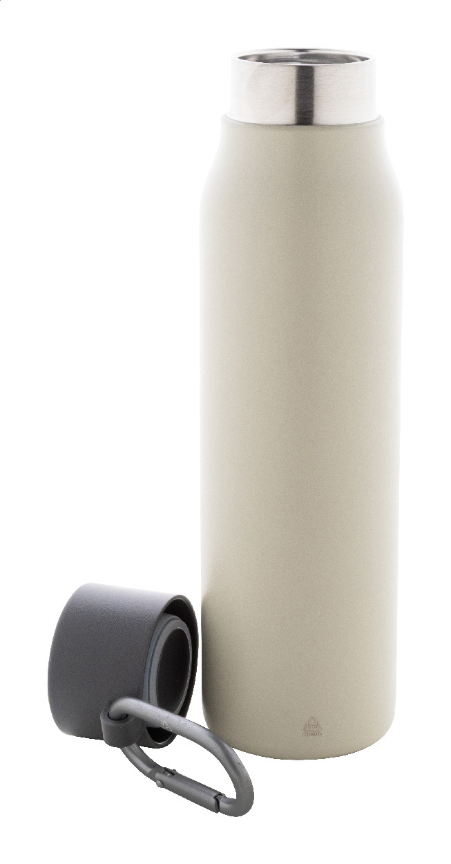 Dvoustěnná vakuová láhev z recyklované nerezové oceli s víčkem z PP a karabinou z recyklovaného hliníku. 500 ml.