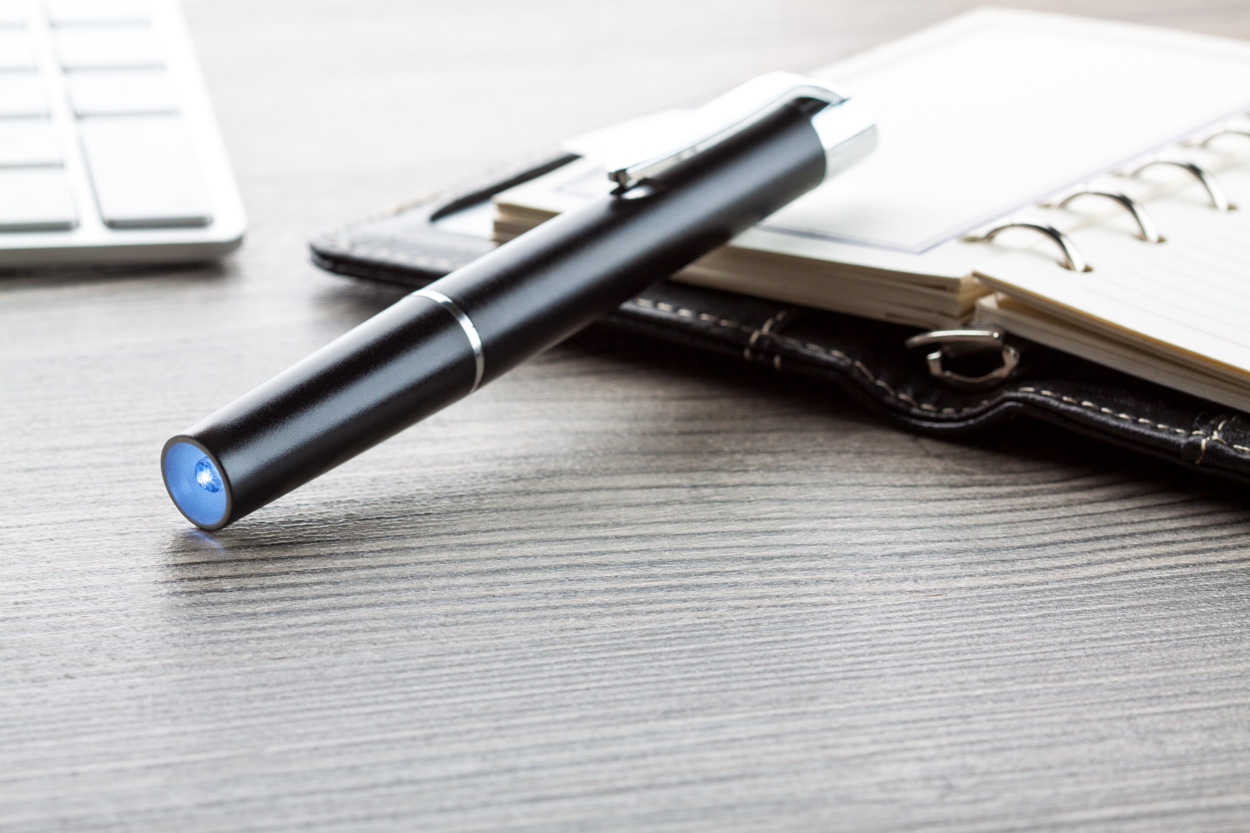 Svítilna ve tvaru pera. Dodáváno s baterií.
