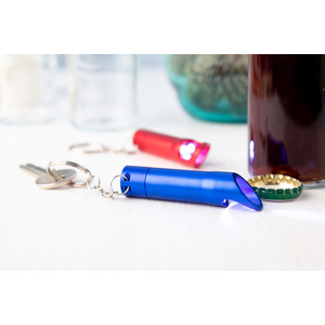 Mini hliníková baterka s 3 LED diodami, otvírákem na láhve a přívěškem na klíče. Dodáváno s knoflíkovou baterií.