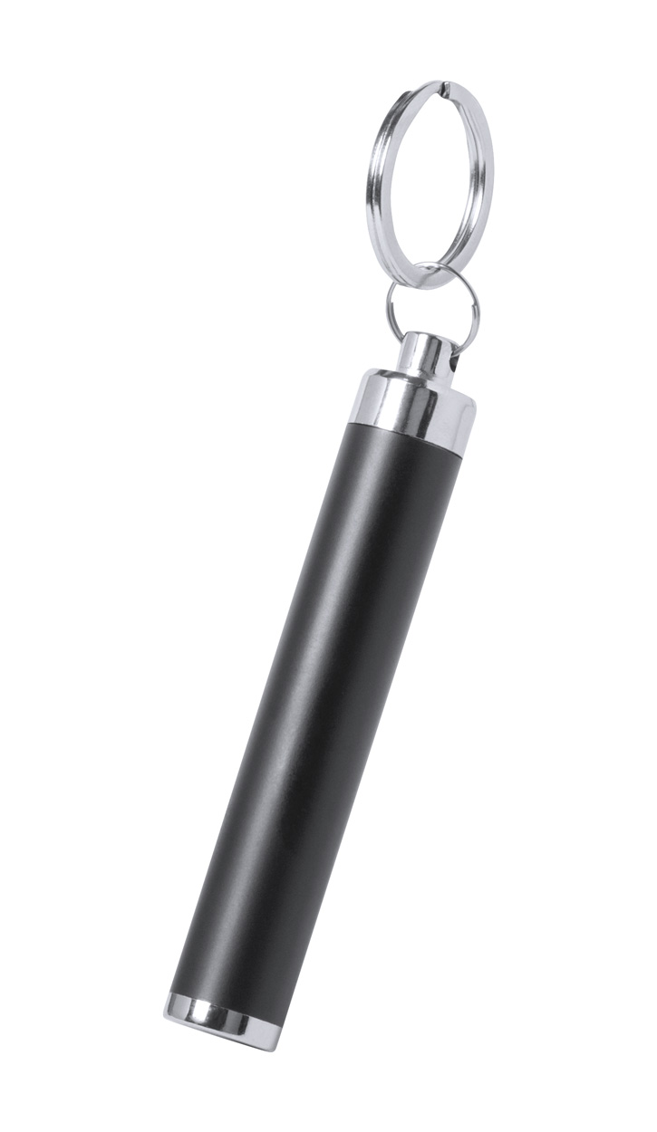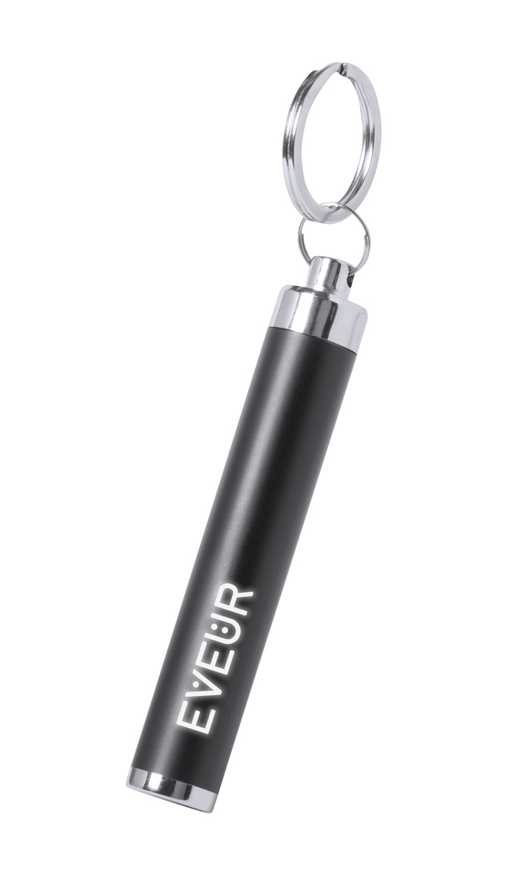 Plastová baterka s 1 LED světlem a kovovým kroužkem na klíče. Vygravírovaná loga na těle baterky svítí. Vč. knoflíkových baterií.