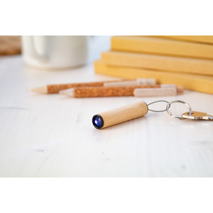 Bambusová mini baterka s bílou LED a kovovým kroužkem na klíče. S knoflíkovou baterií.
