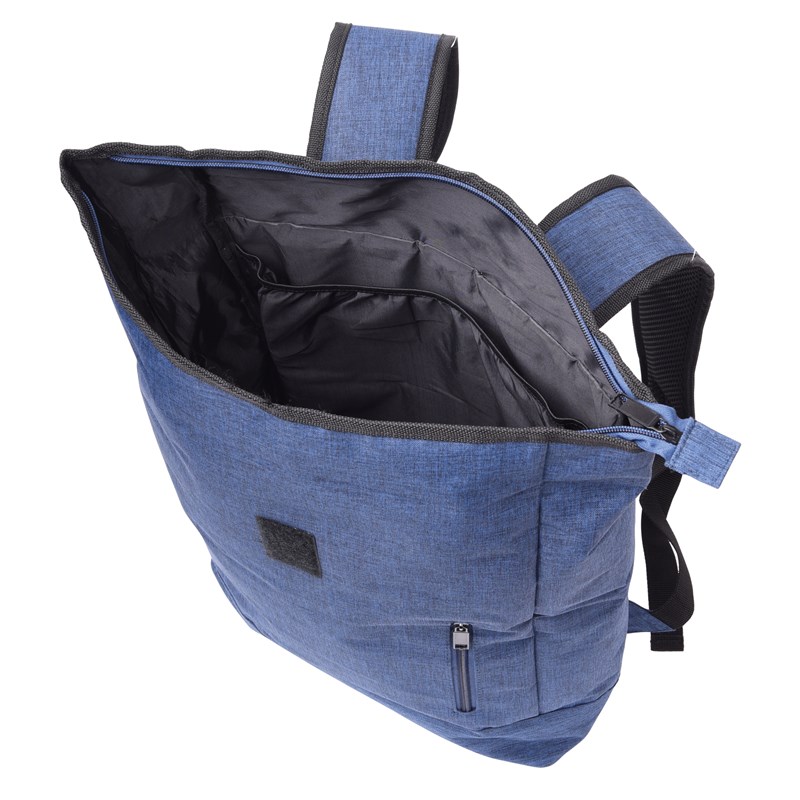 Svislá přední kapsa na zip, hlavní kapsa na zip a polstrovaná vnitřní kapsa na notebook nebo tablet, lze srolovat a uzavřít pomocí suchého zipu, polstrované ramenní popruhy a zádová část, madlo na uchopení.