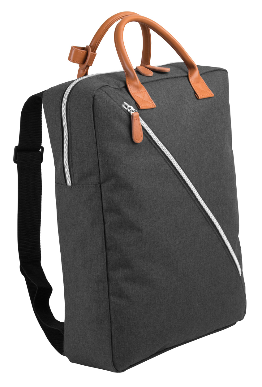 Batoh s přihrádkami na zip, vypolstrovanou kapsou na laptop, ucha z PU kůže a nastavitelný ramenní popruh. 300D polyester.
