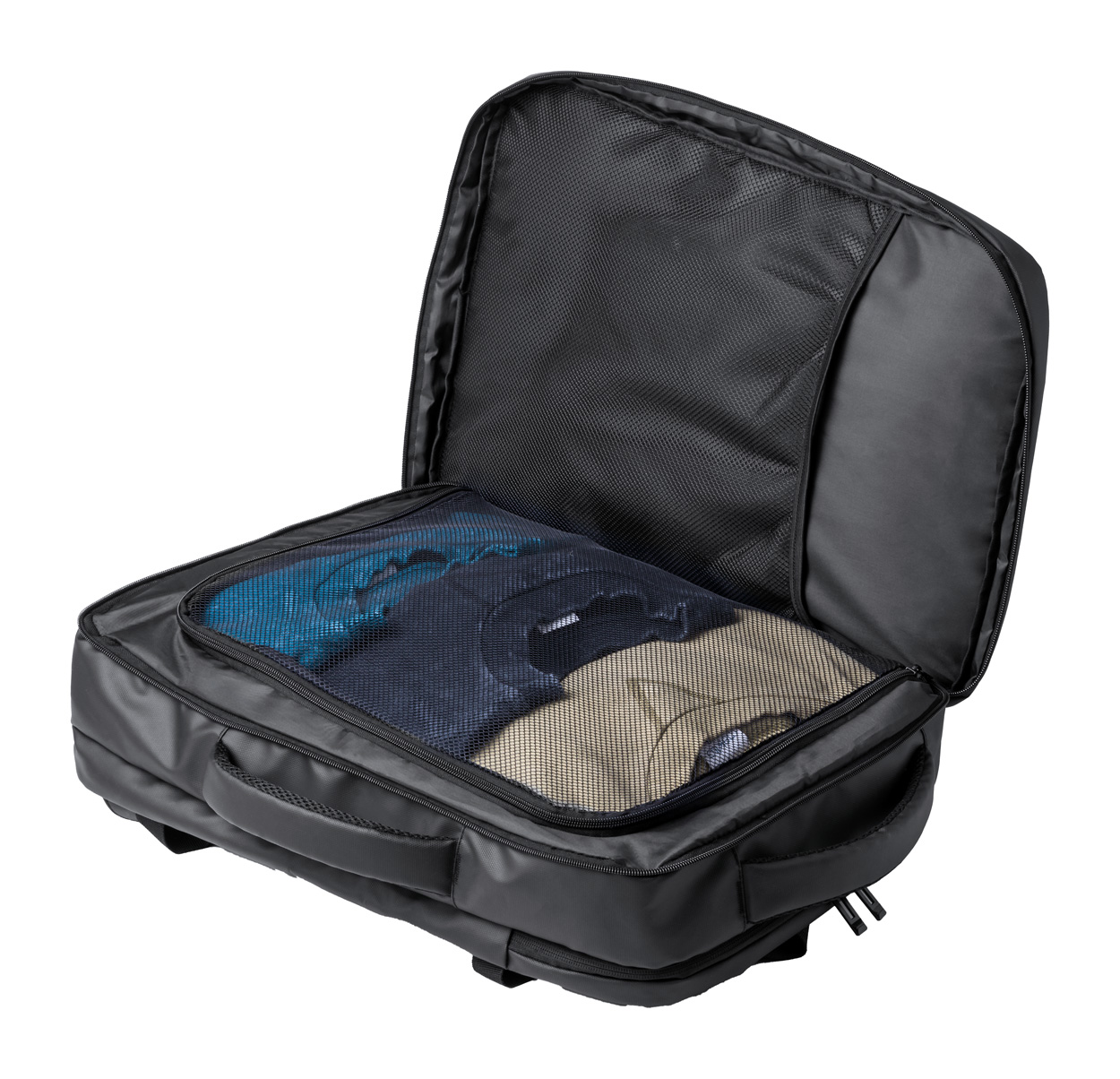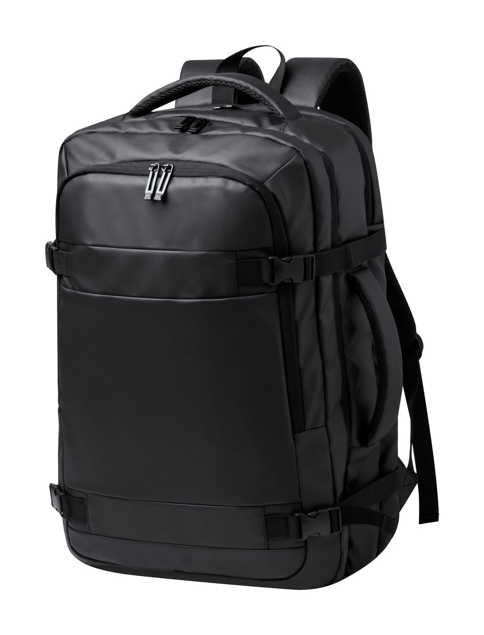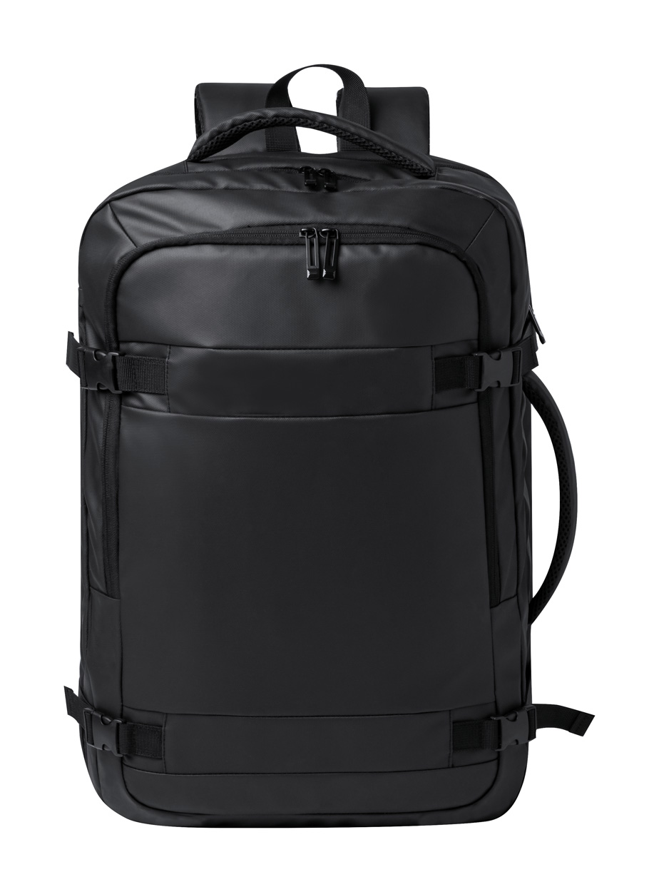 Batoh z PU kůže s přihrádkami na zip, polstrovanou přihrádkou na notebook (17") a síťovanou přihrádkou, popruhem na vozík, polstrovanými zády a ramenními popruhy.