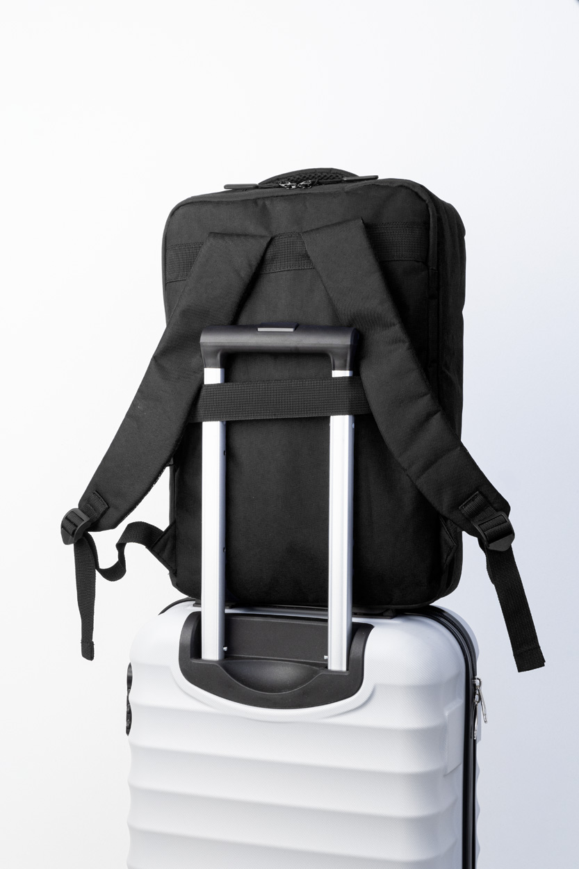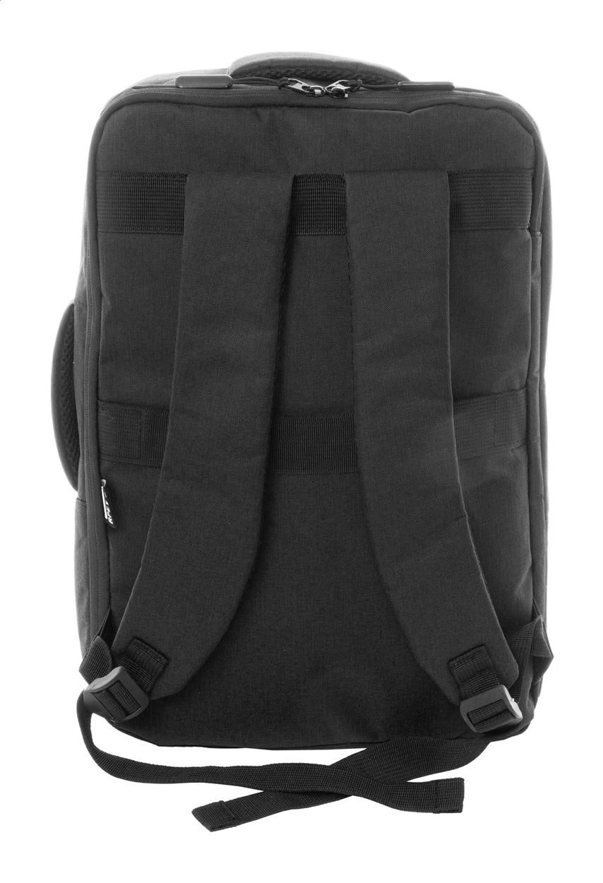 Dvojfunkční RPET batoh a taška na dokumenty s přihrádkou na zip a polstrovanou přihrádkou na notebook (15"). S popruhem na vozík, polstrovanými zády a ramenními popruhy. Polyester 300D RPET, s výrazným štítkem RPET.