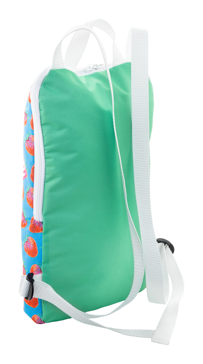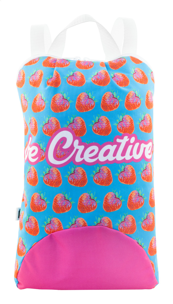 Na zakázku vyrobený RPET mini batoh s přihrádkou na zip. S celoplošnou sublimační tištěnou grafikou, cena nezahrnuje tiskovou přípravu. 600D RPET polyester s výrazným štítkem RPET. Min. mn.: 25 ks.