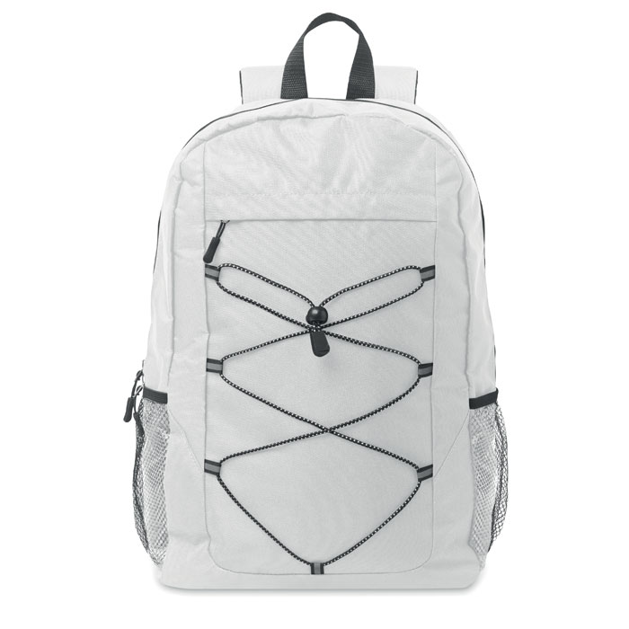 Batoh z polyesteru 600D RPET s ozdobnou šňůrkou a přední kapsou na zip. Síťované kapsy na obou stranách.
