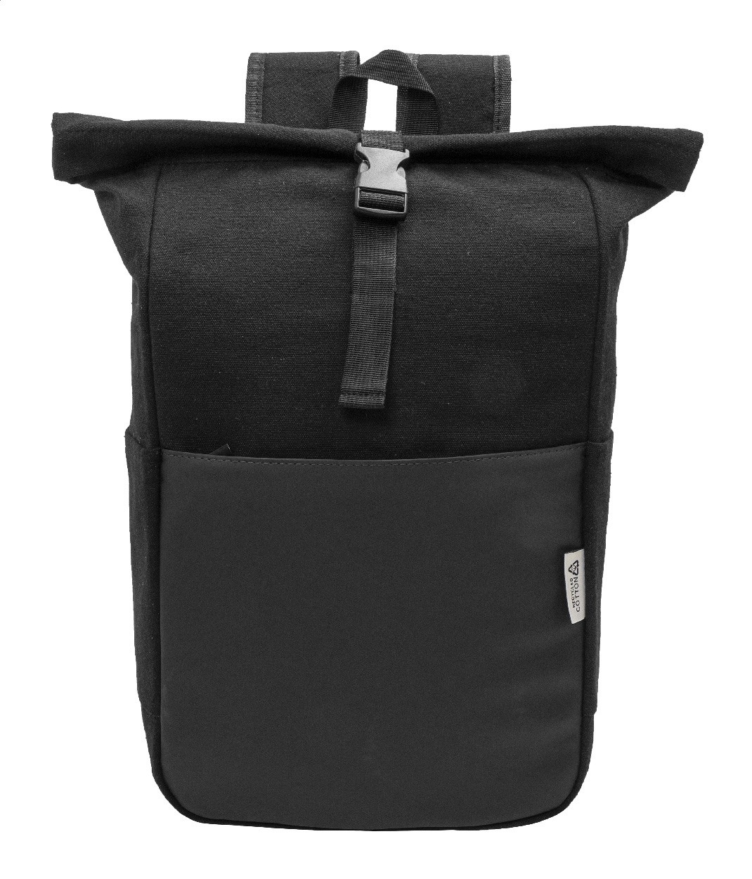 Rolovací batoh z recyklovaného plátna se zapínáním na přezku a přední kapsou na zip z měkké recyklované PU kůže. S polstrovanou přihrádkou na notebook (15"), bočními kapsami, polstrovanými zády a ramenními popruhy. 70% recyklované bavlny a 30% RPET polyesteru. S výrazným štítkem z recyklované bavlny.