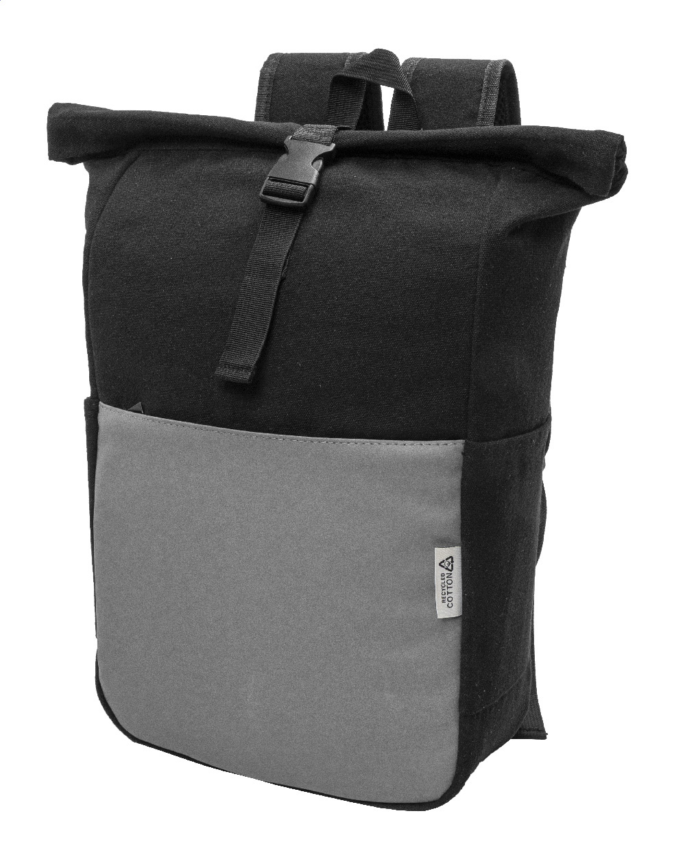 Rolovací batoh z recyklovaného plátna se zapínáním na přezku a přední kapsou na zip z měkké recyklované PU kůže. S polstrovanou přihrádkou na notebook (15"), bočními kapsami, polstrovanými zády a ramenními popruhy. 70% recyklované bavlny a 30% RPET polyesteru. S výrazným štítkem z recyklované bavlny.
