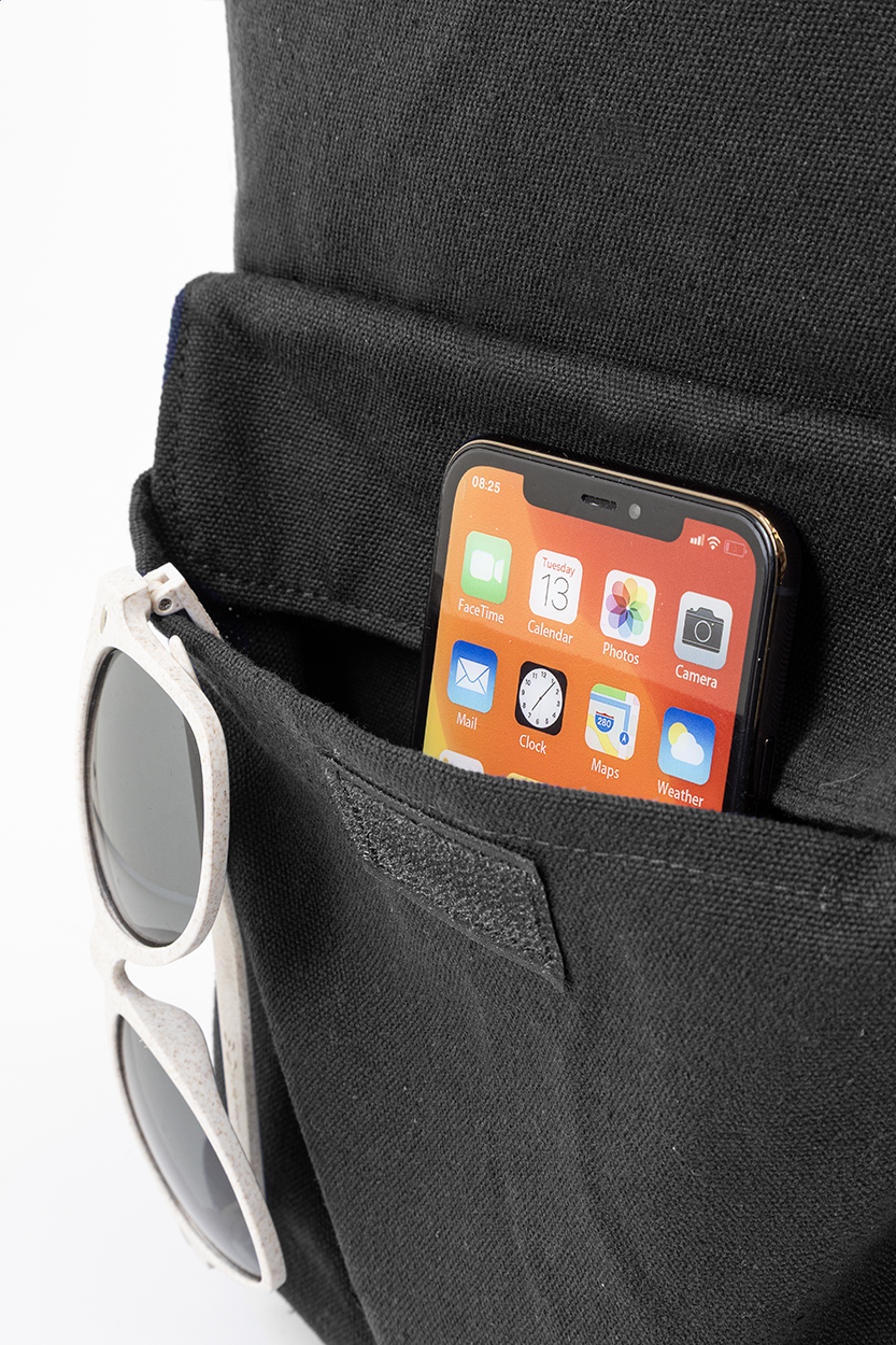 Batoh z recyklovaného plátna s hlavní přihrádkou na zip, polstrovanou přihrádkou na notebook (13") a přední kapsou na suchý zip. 70 % recyklované bavlny a 30 % RPET polyesteru. S výraznou etiketou o recyklované bavlně.