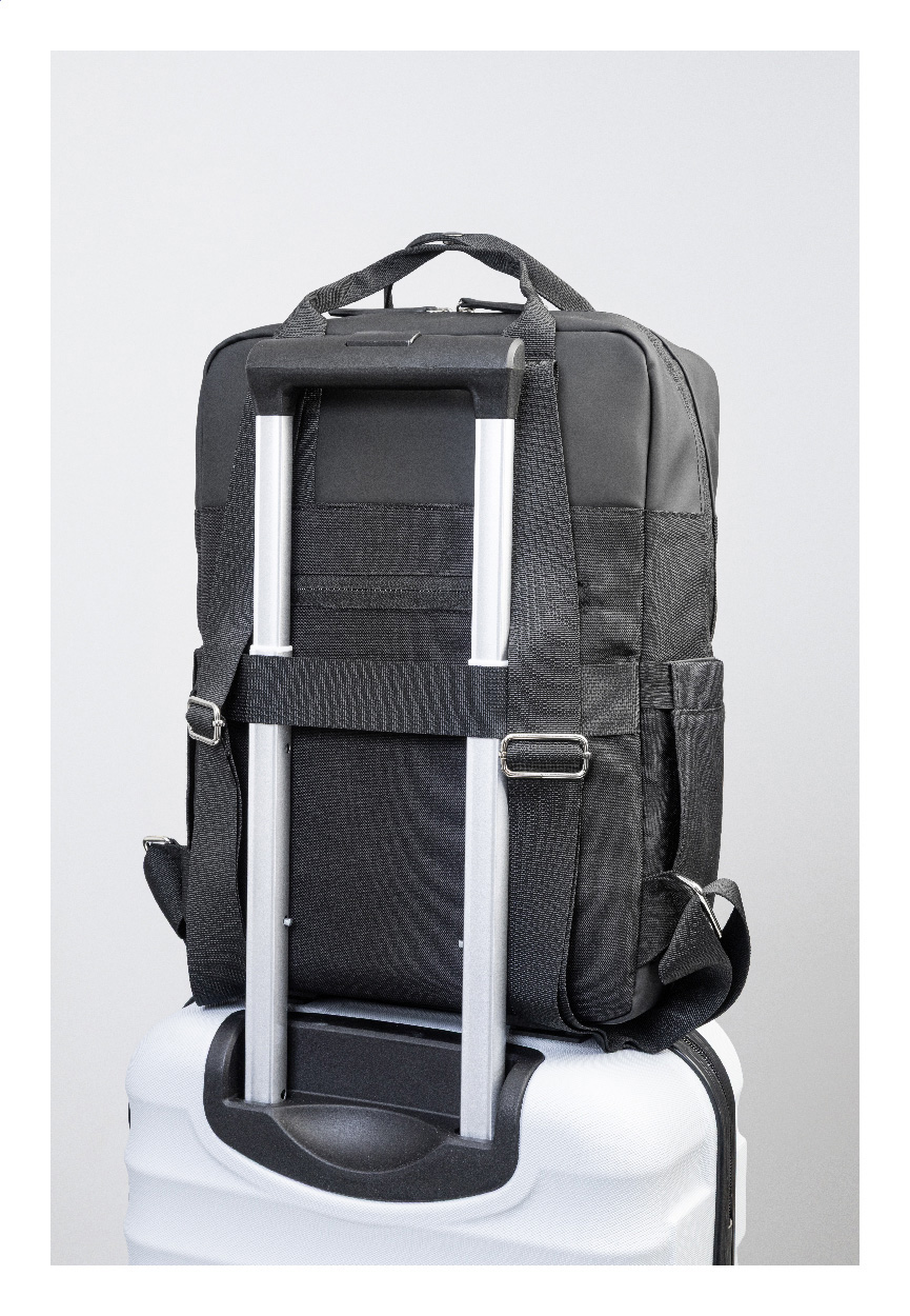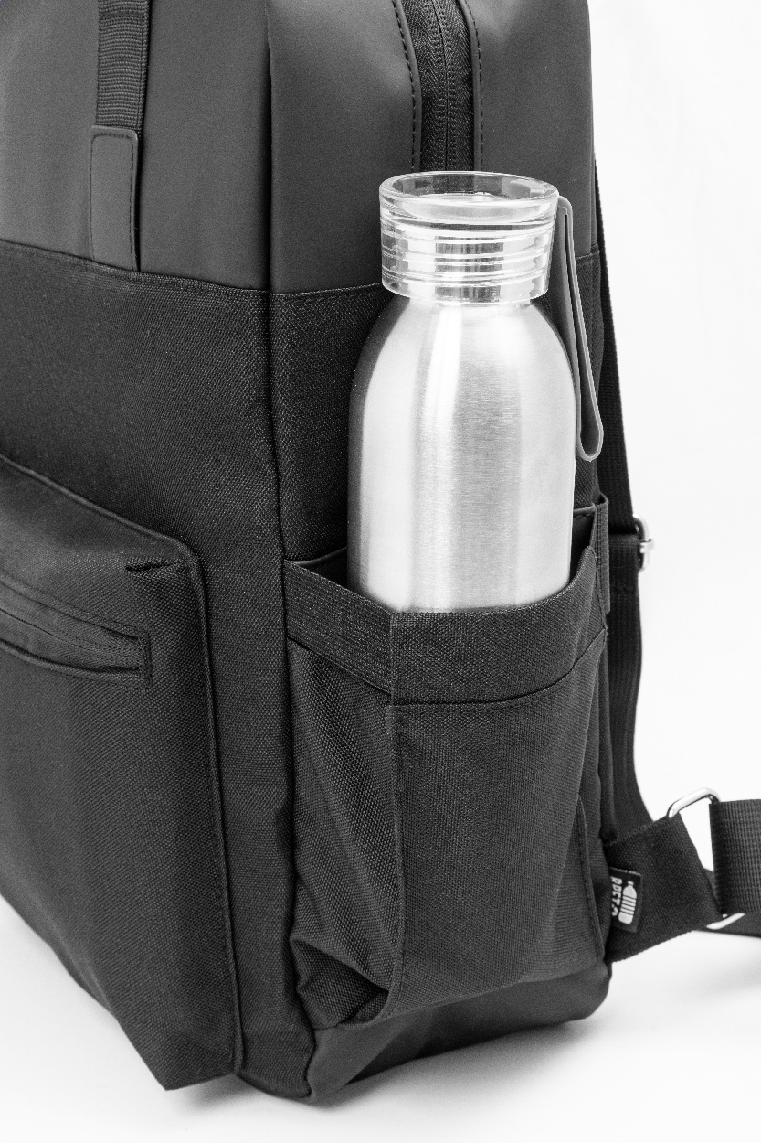 Batoh z RPET s měkkým vrškem z PU kůže, přihrádkou na zip, přední kapsou na zip, bočními kapsami a kapsou proti krádeži. S popruhem na kolečkách, polstrovanými zády a přihrádkou na notebook (15"). 900D RPET polyester s výraznou nálepkou RPET. V netkaném protiprachovém pytlíku z RPET.
