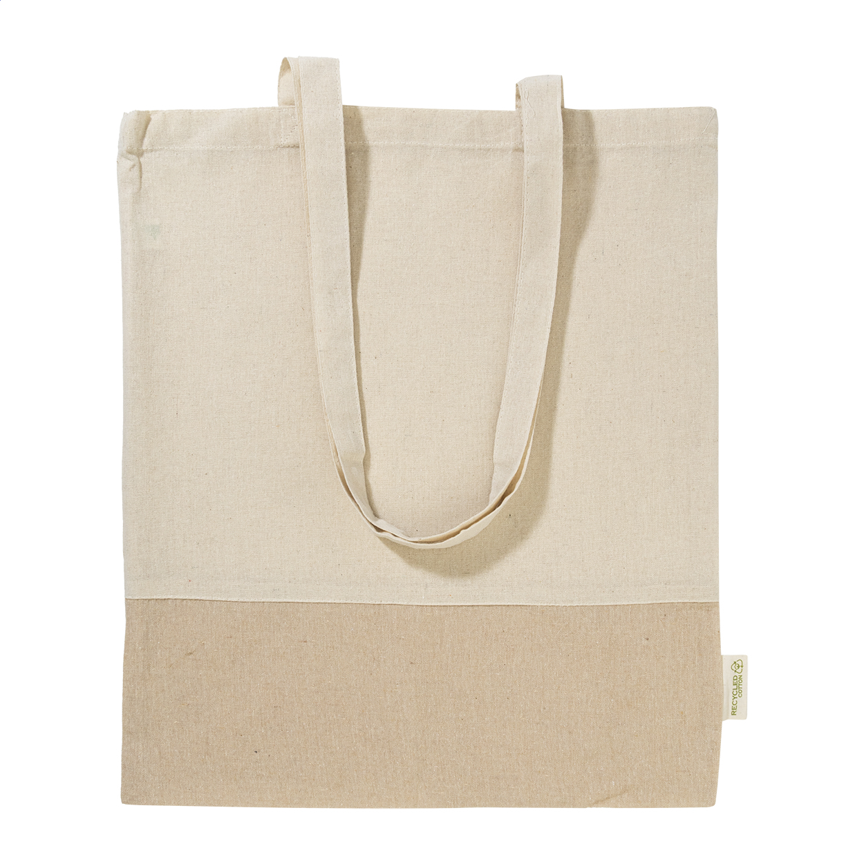 Dvoubarevná nákupní taška z recyklované bavlny s dlouhými uchy a výrazným štítkem z recyklované bavlny. 100% recyklovaná bavlna, 120 g/m².