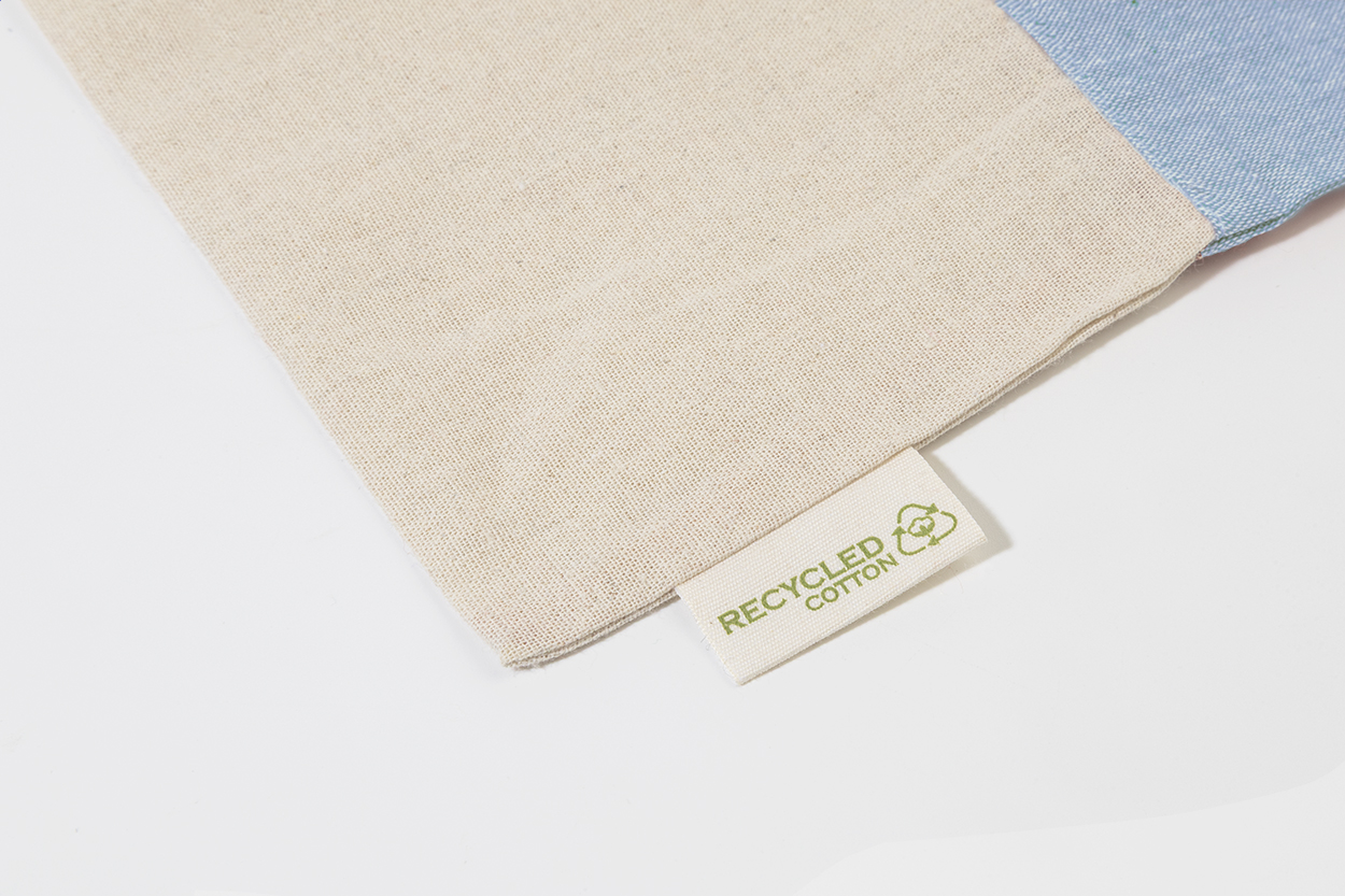 Dvoubarevná nákupní taška z recyklované bavlny s dlouhými uchy a výrazným štítkem z recyklované bavlny. 100% recyklovaná bavlna, 120 g/m².