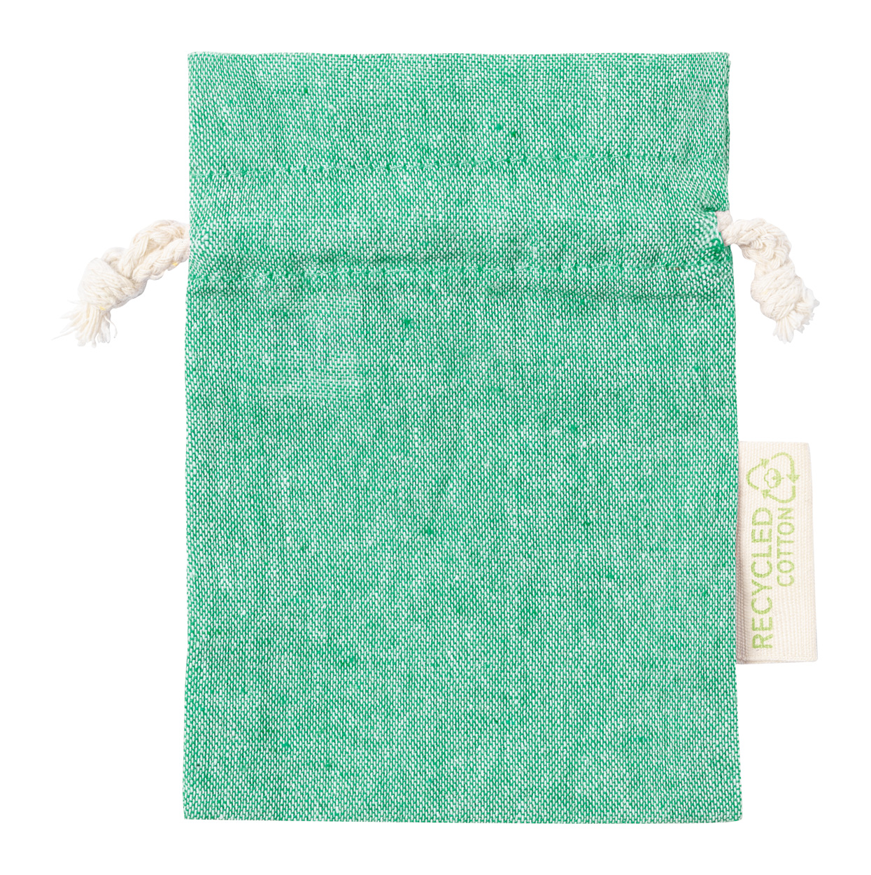 Dárkový pytlík z recyklované bavlny se stahováním na šňůrku. S výrazným štítkem z recyklované bavlny. 100% recyklovaná bavlna, 120 g/m².