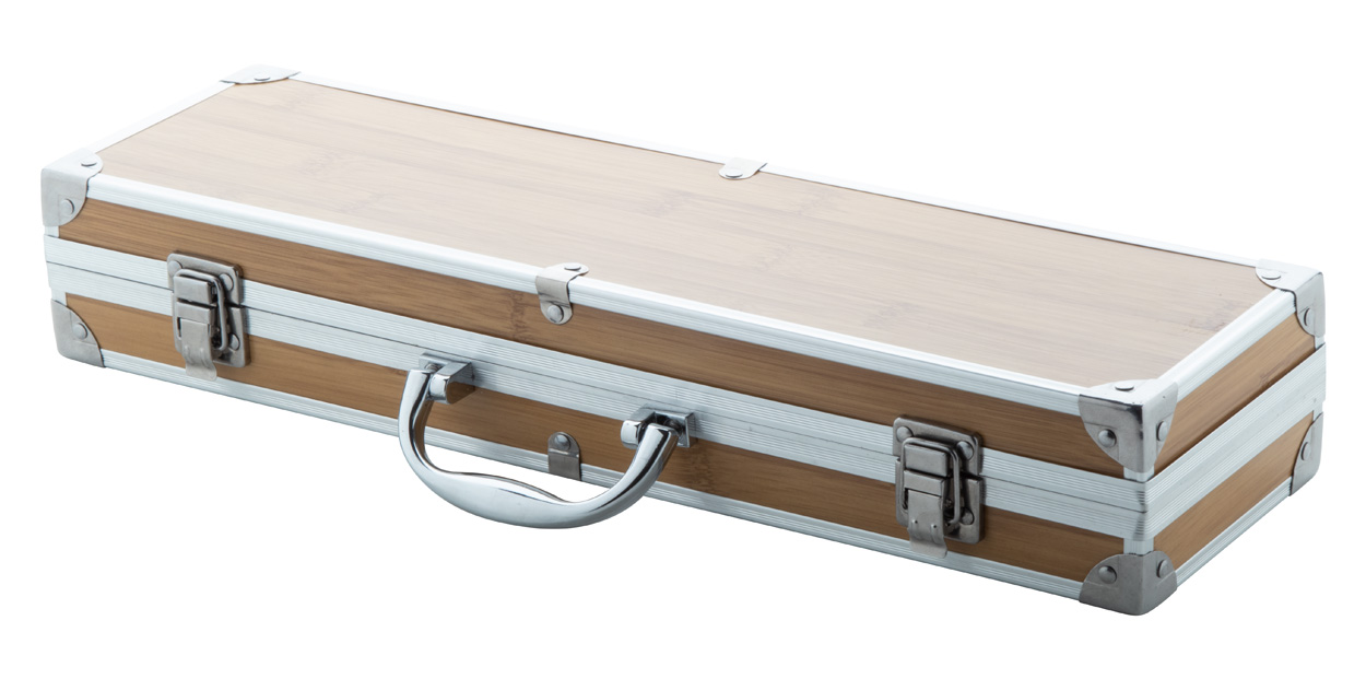 BBQ sada z nerez oceli a s bambusovou rukojetí (vidlička, kleště a obracečka s otvírákem na lahve). S bambusovým vzorem v hliníkovém pouzdře.