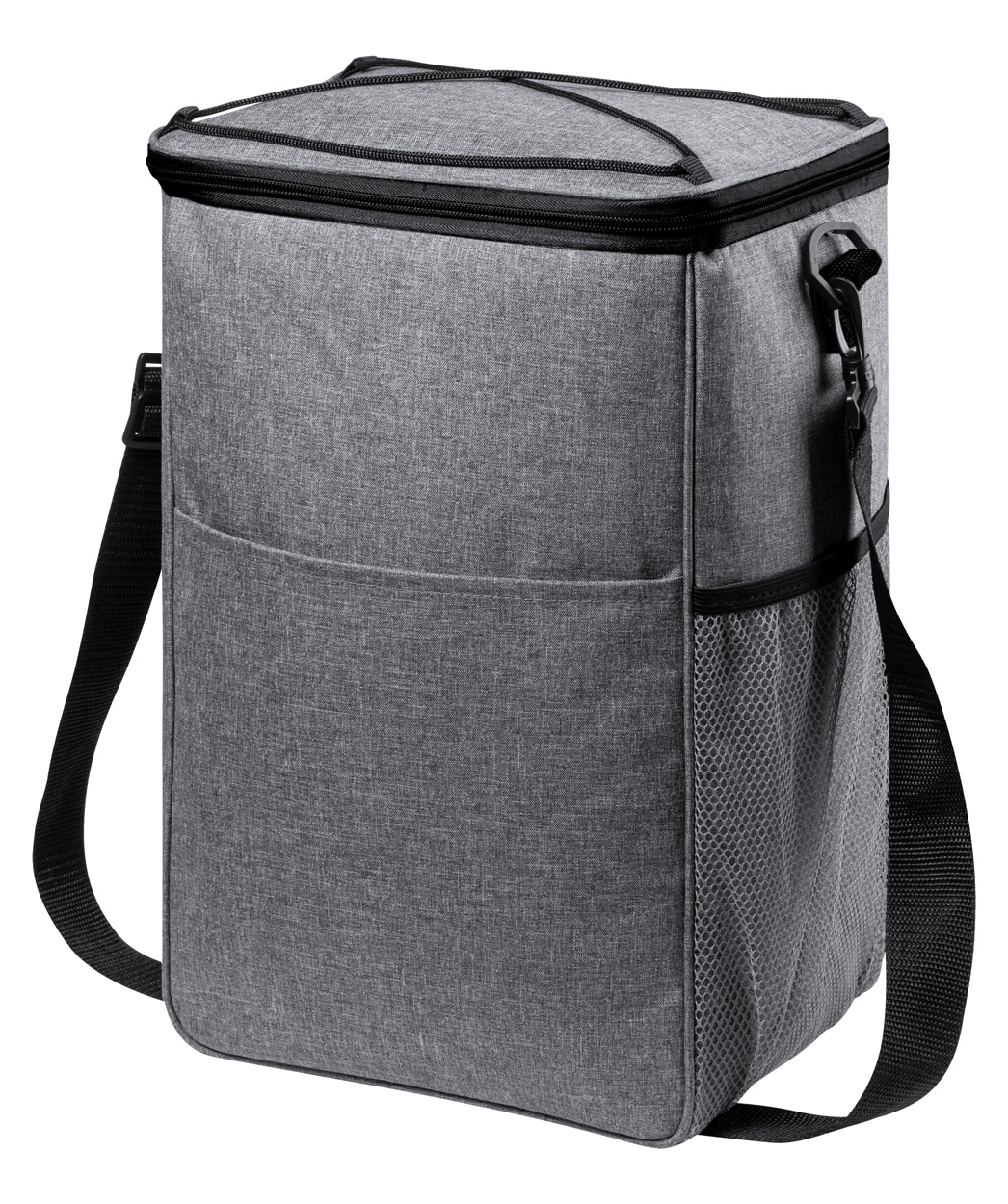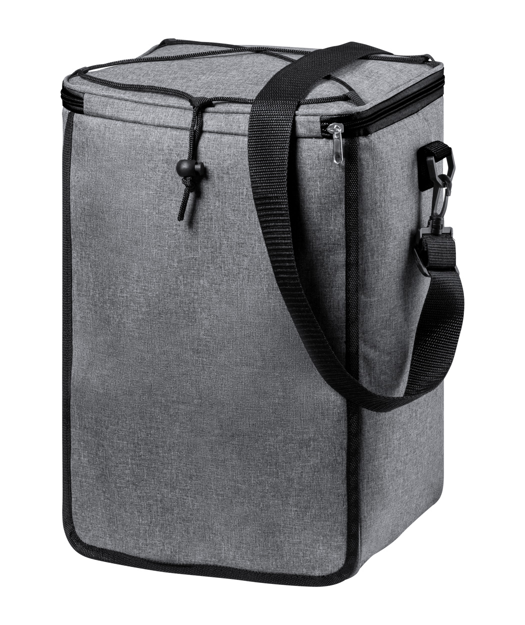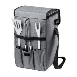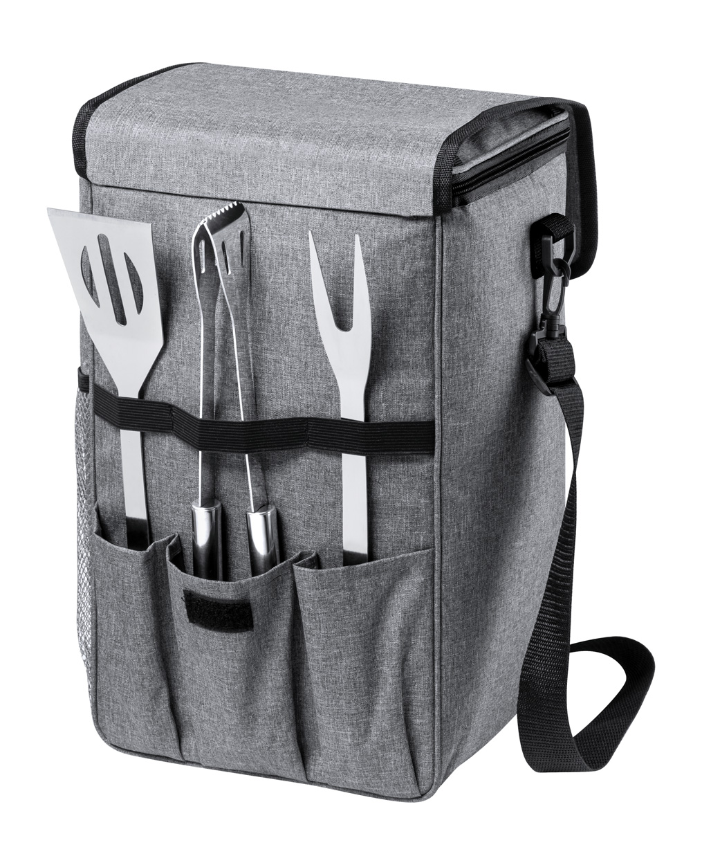 Chladicí taška RPET s PEVA výstelkou, přihrádkou na zip a nastavitelným ramenním popruhem. Včetně 3 ks nerezové BBQ sady (vidlička, lopatka a klip). 600D RPET polyester s výrazným štítkem RPET.