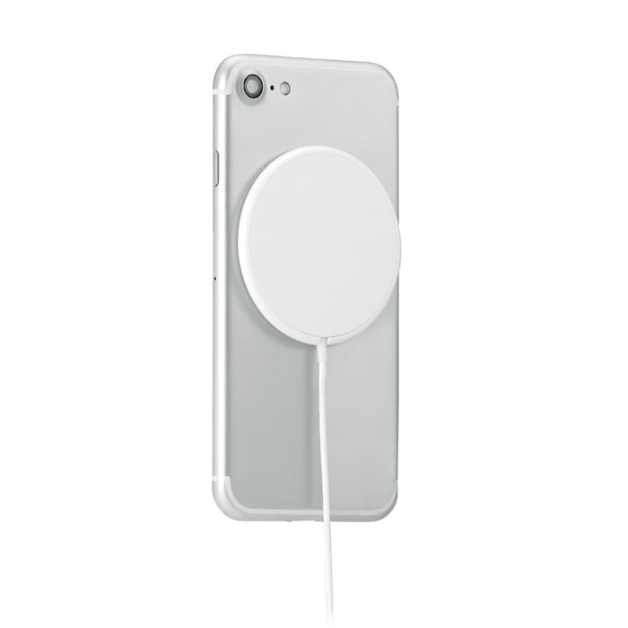 Magnetická bezdrátová nabíječka z ABS. Výstup: DC 9V / 1,1A (10W) pro rychlé nabíjení. Kompatibilní s iPhone® 12 a novějšími. Včetně dalšího magnetického kovového kroužku pro podporu nabíjení jiných nemagnetických bezdrátově nabíjecích telefonů.