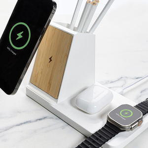 Univerzální bezdrátově nabíjecí stanice pro až 3 zařízení se stojánkem na pera. Část určená pro telefon je vybavená duální cívkou s nejvyšším možným výkonem 15 W, dodatečná plocha pro další telefon nebo sluchátka s výkonem 5 W, nabíječka na hodinky s výkonem 2,5W. Dodatečné USB A a USB C na zadní straně pro nabíjení skrze kabel. Vyrobeno z RCS recyklovaného ABS plastu. RCS (Recycled Claim Standard) je globální standard, který umožňuje ověřit použití recyklovaného materiálu v produktu napříč celým dodavatelským řetězcem. Celkový podíl recyklátu dle váhy produktu: 73 %. Nabíjecí část vyrobená ze 100 % FSC bambusu. Včetně 120 cm USB C nabíjecího kabelu z RCS recyklovaného TPE. Produkt i příslušenství bez PVC. Baleno v FSC kraftové dárkové krabičce. USB C vstup: 9V/3A. Bezdrát. výstup 1: 9V/1.1A; 9V/1.67 A/(15W), bezdrát. výstup 2: 5V/1A (5W), bezdrát. výstup 3: 5V/0.5A (2.5W), USB A/USB C výstup: 5V / 2.1A . Ochranný vzor®.