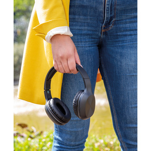 Moderní bezdrátová sluchátka vyrobená z lehkého RCS recyklovaného ABS plastu. RCS (Recycled Claim Standard) je globální standard, který umožňuje ověřit použití recyklovaného materiálu v produktu napříč celým dodavatelským řetězcem. Celkový podíl recyklátu dle váhy produktu: 73 %. Pohodlné měkké náušníky a polstrovaná část přes hlavu z PU. Náušníky překrývající uši zajišťují optimální zvukový zážitek bez okolního ruchu. Zabudovaná baterie s kapacitou 200 mAh pro poslech po dobu až 5 hodin na jedno nabití (1,5 hodiny). BT 5.1 pro hladké bezdrátové připojení na vzdálenost až 10m. Mikrofon pro telefonování. Včetně nabíjecího kabelu z GRS recyklovaného TPE. Baleno v FSC® kraftové dárkové krabičce. Produkt i příslušenství bez PVC.