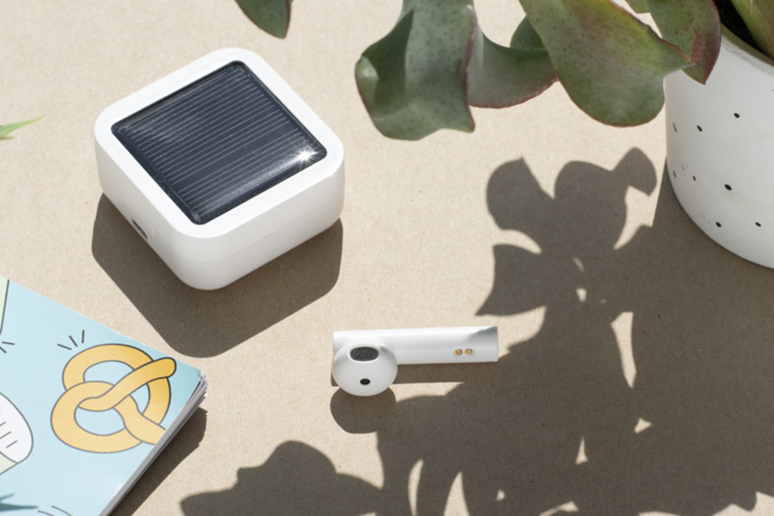Bezdrátová sluchátka SUONO se vyznačují velmi dobrou kvalitou zvuku a vysokým nošením pohodlí díky perfektnímu tvaru. Praktická kazeta slouží také jako nabíjecí stanice. Může být tradičně napájena nabíječkou nebo solárním panelem. Kapacita baterie je 200 mAh, což je dost na asi 5-6 hodin ve slunečním světle. Kapacita sluchátek je 30 mAh, což je dost na asi 2 hodiny používání. Vestav