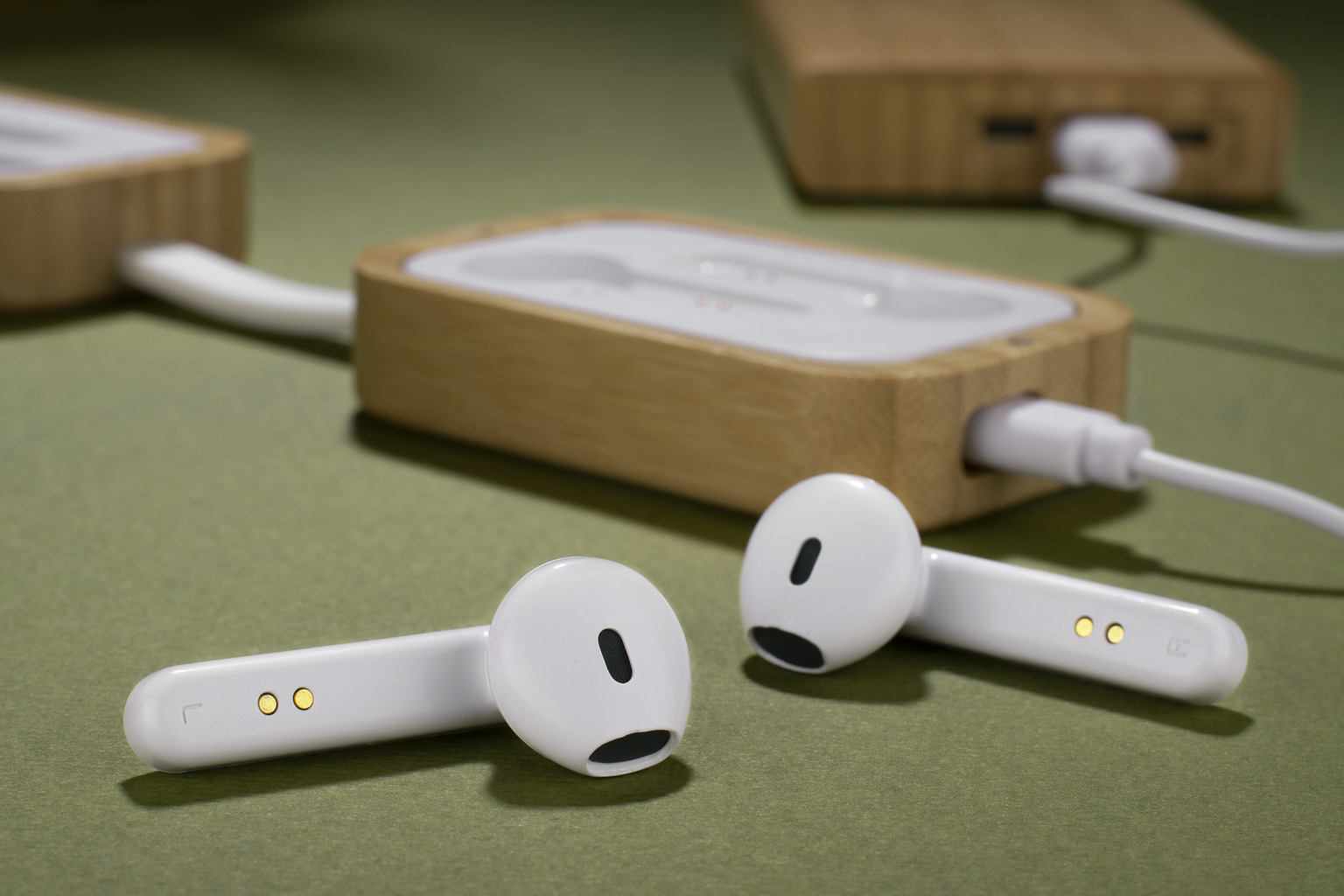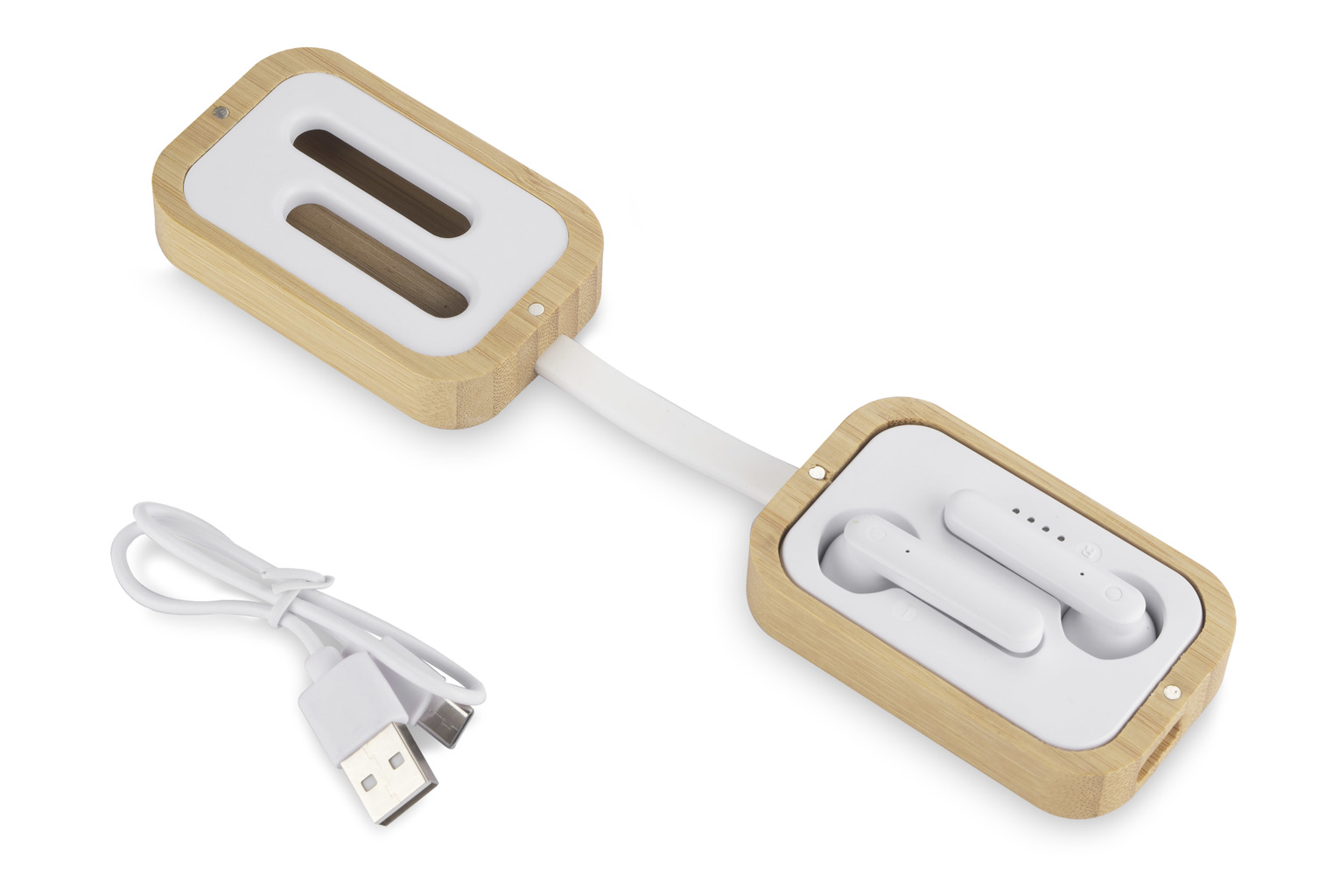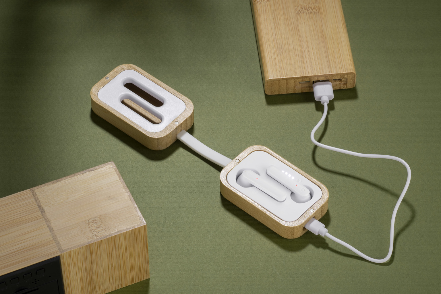 Bezdrátové sluchátka BAHO jsou vložené do bambusového pouzdra s magnetickým zavíráním. Díky své zajímavé a nevšední formě nezůstává bez povšimnutí. Jsou vybavené indikátorem úrovně nabíti baterie, díky čemu zařízení nikdy nepřekvapí nízkým stavem nabíti baterie. Dotykové ovládání sluchátek přináší větší pohodlí při používání. Sluchátka mají zabudovaný mikrofon, co umožňuje provádění rozhovorů. Může se používat pouze jedno sluchátko. Technické údaje: verze Bluetooth: V5.1, dosah Bluetooth: až 10 m, kapacita baterie v každém sluchátku: 30 mAh, kapacita baterie v pouzdru: 200 mAh, max. výdrž až 3 hod., nabíjecí konektor typu-c.