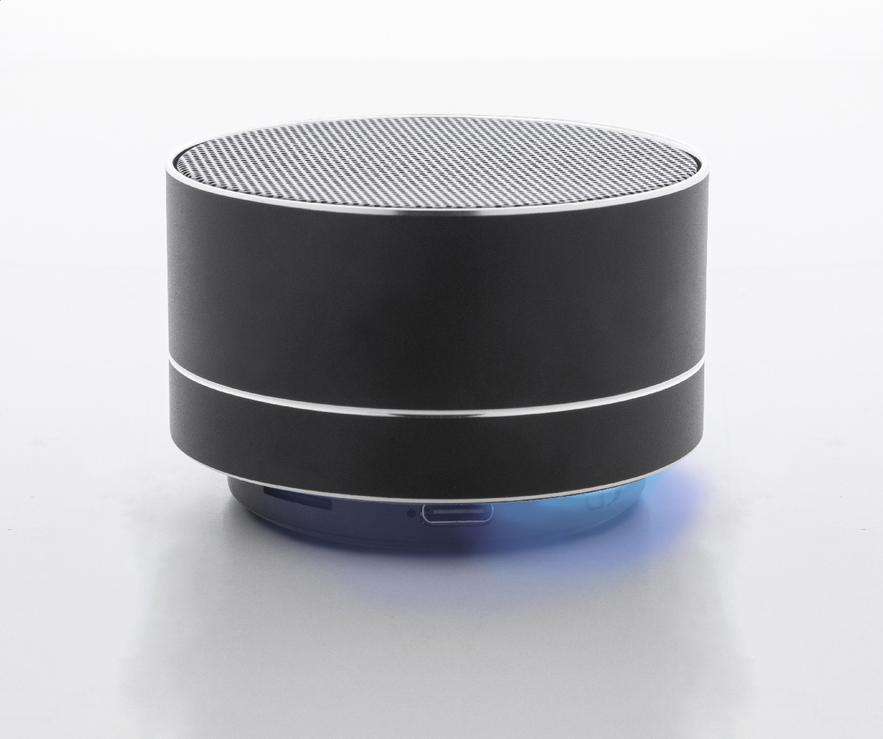 Bezdrátový reproduktor z recyklovaného hliníku s kovovou síťovinou, LED světlem na spodní straně a dobíjecí baterií (300 mAh). S funkcí handsfree hovorů a přehrávání MP3 z micro SD karty. Včetně nabíjecího kabelu USB.