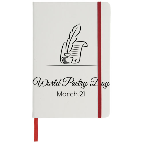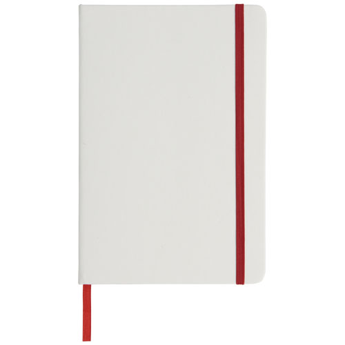 Bílý zápisník A5 s barevným elastickým zavíráním a stužkou. Obsahuje 80 listů linkovaného papíru (60g/m2). Digitální tisk lze provést na přebal.